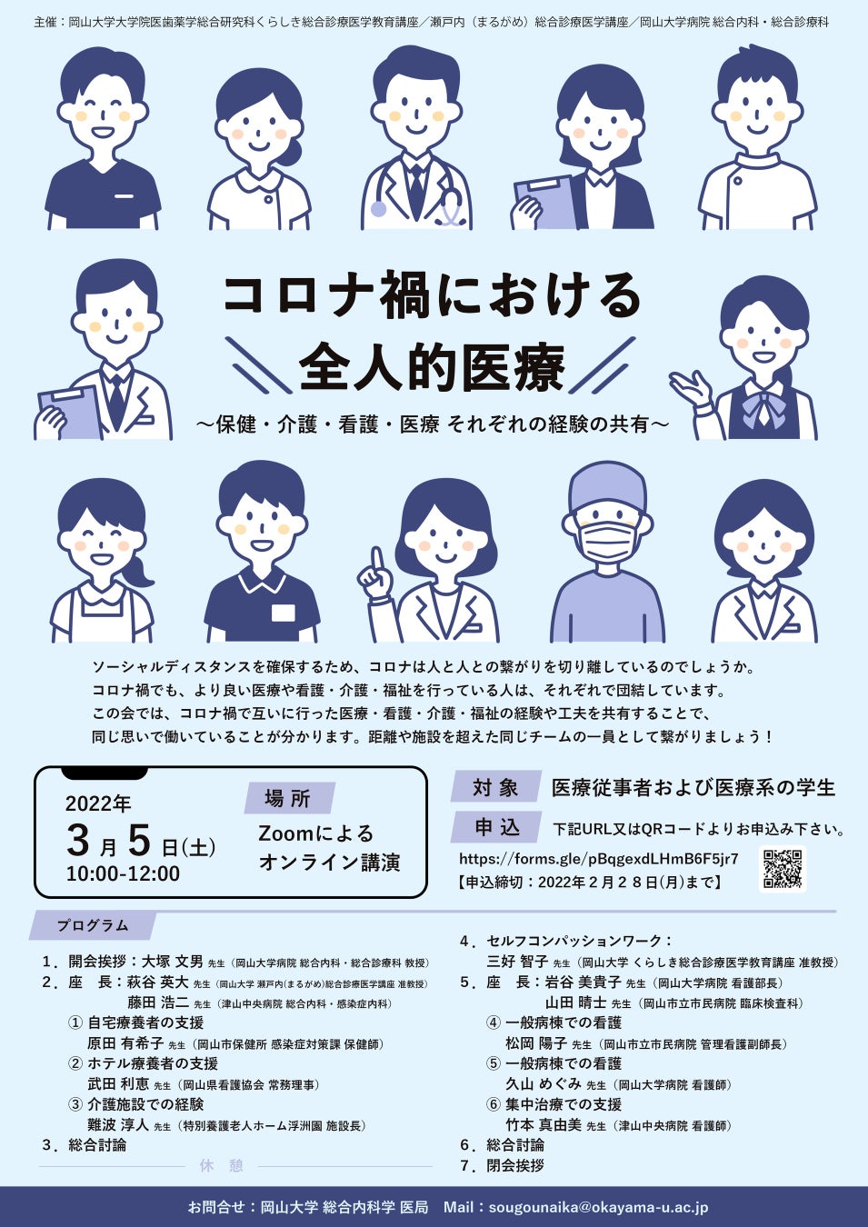 - 【岡山大学】「コロナ禍における全人的医療 ~保健・介護・看護・医療 それぞれの経験の共有~」〔3/5(土)オンライン〕