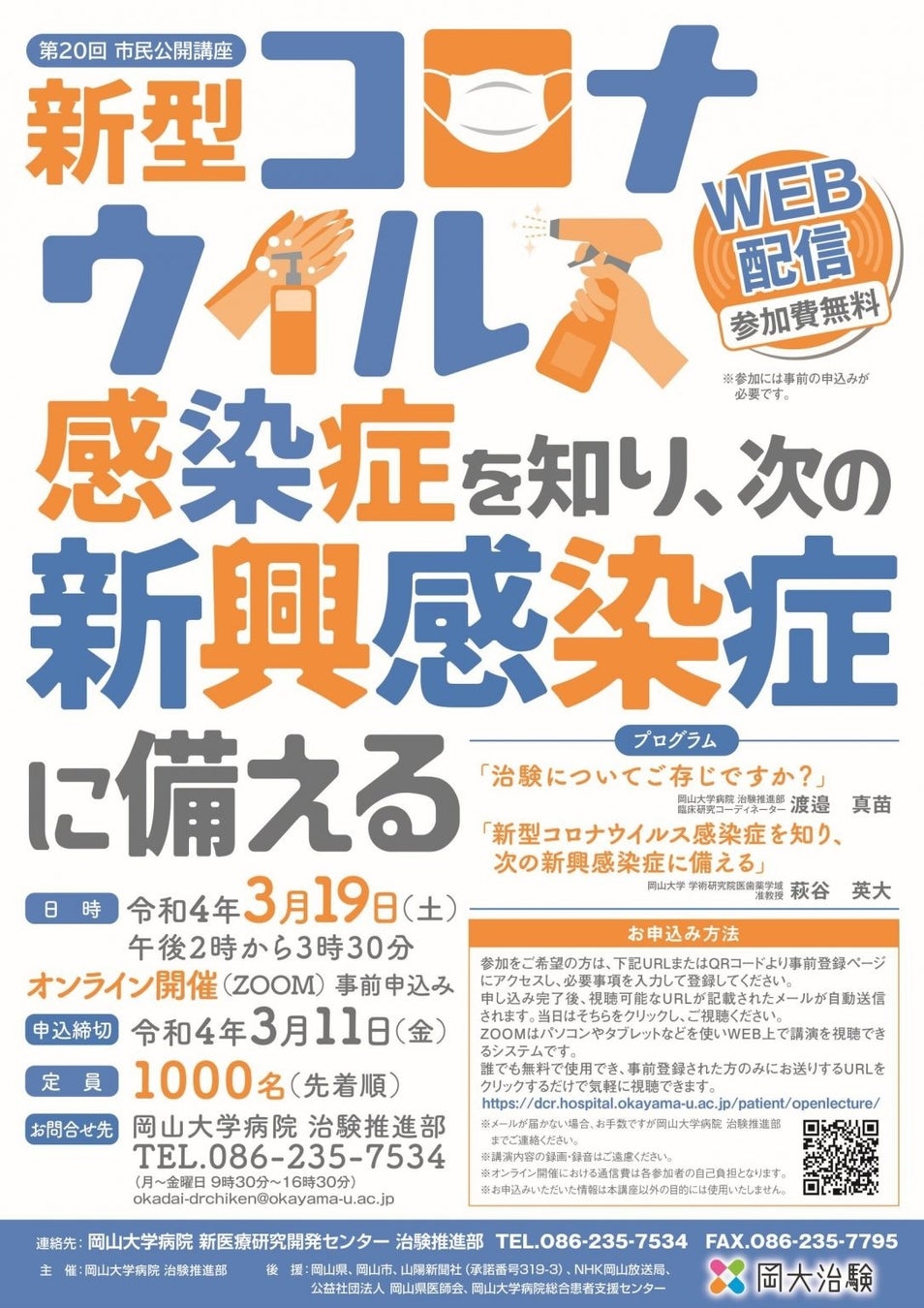 - 【岡山大学】岡山大学病院治験推進部 第20回市民公開講座「新型コロナウイルス感染症を知り、新興感染症に備える」〔3/19,土 オンライン〕