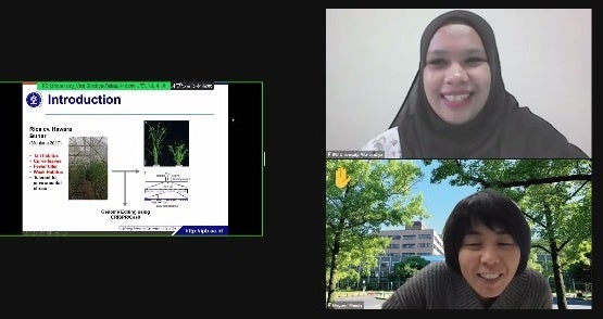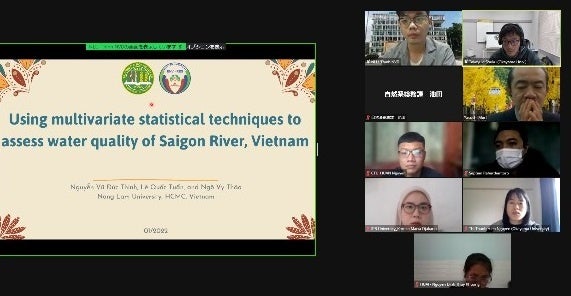 本研究発表会は、日本、ベトナム、インドネシアの学生が互いの国におけるSDGsの捉え方や研究開発の方向性等の相違について理解を深め、グローバルな視点の重要性を認識することを目的として行われた取組で、今回が2回目の開催となります。本研究科の学生2名とベトナム、インドネシアの協定校の学生12名が環境・生命領域のSDGsに関連する研究の成果発表を英語により行い、互いの研究への理解を深めました。各発表の後には質疑応答の時間が設けられ、活発な意見交換が行われました。
