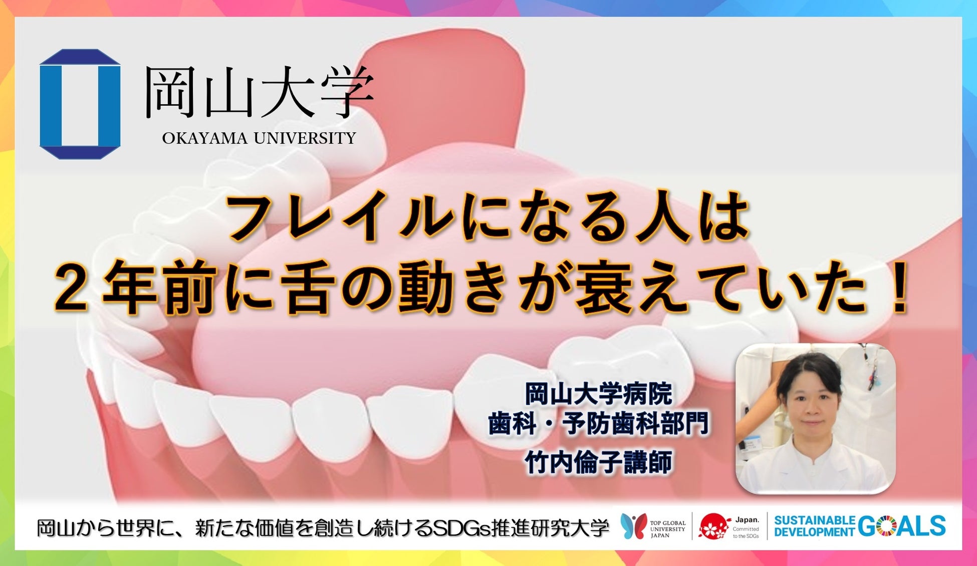国立大学法人岡山大学(本部:岡山市北区津島中、学長:槇野博史)の岡山大学病院(本院:岡山市北区鹿田町、病院長:前田嘉信)歯科・予防歯科部門の竹内倫子講師と岡山大学学術研究院医歯薬学域予防歯科学分野の森田学教授らの研究グループは、「タ」の1秒間に発音できる回数が少ない人は2年後にフレイルになりやすいことを明らかにしました。