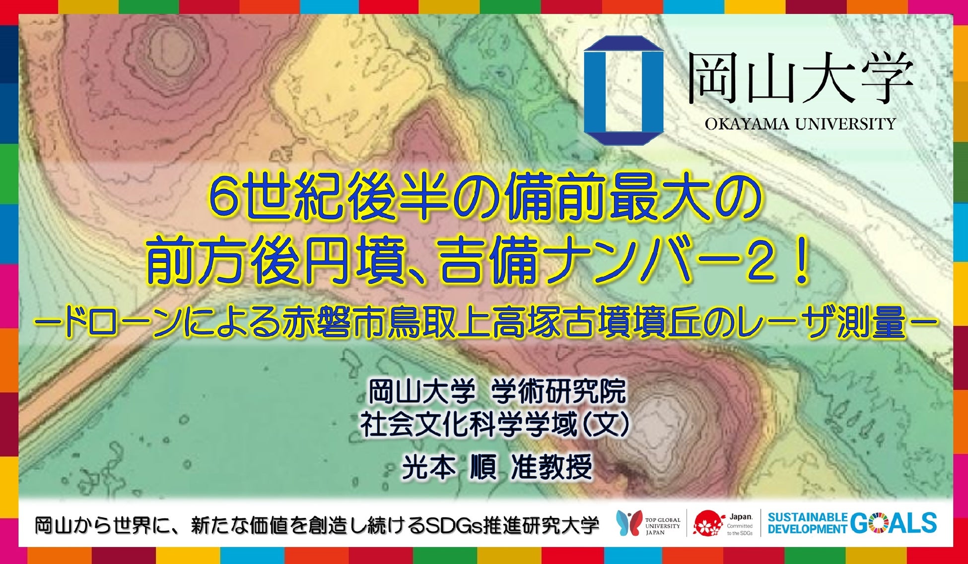 国立大学法人岡山大学(本部:岡山市北区、学長:槇野博史)学術研究院社会文化科学学域(文)の光本順准教授とライアン・ジョセフ特任助教、岡山大学埋蔵文化財調査研究センターの山口雄治助教らの研究チームは、6世紀後半の岡山県赤磐市鳥取上高塚古墳の墳丘について、レーザシステム搭載ドローンでの測量により墳丘地表面の三次元データを取得し、墳丘の実態を初めて詳細に明らかにしました。