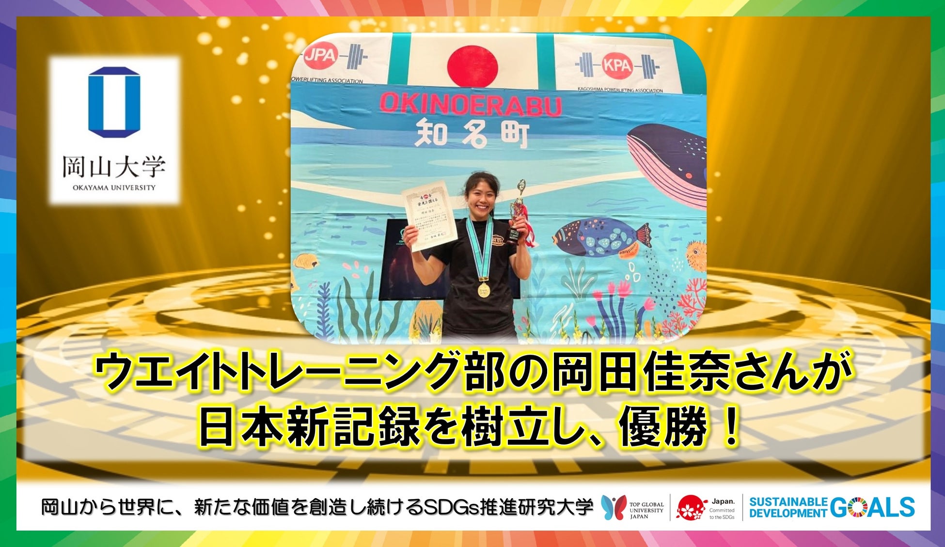 今回の結果を受け岡田さんは、「今までジュニアや学生大会に出場させていただいておりました。今回は初めて一般の大会に参加し、すごく刺激的でした。今大会でタイトルが取れたのも、岡山大学ウェイトトレーニング部で4年間指導してくださったコーチや、共に練習に励んだチームメイトのおかげです。大学は卒業しますが、今後も大会等に積極的に参加したいと思います」と話していました。