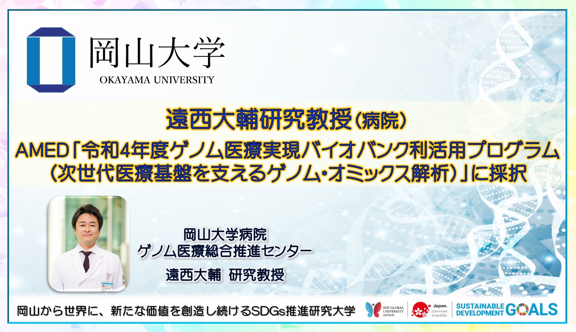 国立大学法人岡山大学(本部:岡山市北区津島中、学長:槇野博史)の岡山大学病院(本院:岡山市北区鹿田町、病院長:前田嘉信)ゲノム医療総合推進センターの遠西大輔研究教授が、国立研究開発法人日本医療研究開発機構(AMED)の「令和4年度ゲノム医療実現バイオバンク利活用プログラム(次世代医療基盤を支えるゲノム・オミックス解析)」に採択されました。