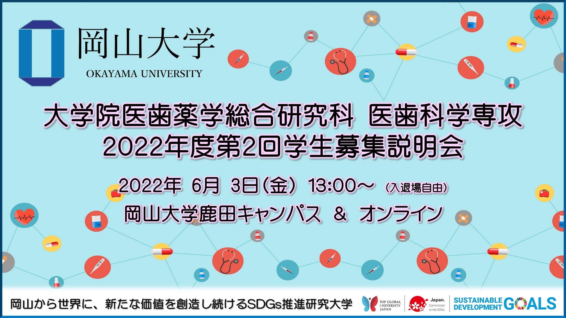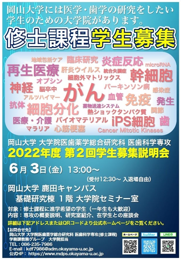 国立大学法人岡山大学(本部:岡山市北区、学長:槇野博史)大学院医歯薬学総合研究科・医歯科学専攻(修士課程)では、2022年6月3日(金)13:00から「2022年度第2回学生募集説明会」を本学鹿田キャンパス(岡山市北区)での現地開催とオンライン開催の同時にて実施します。