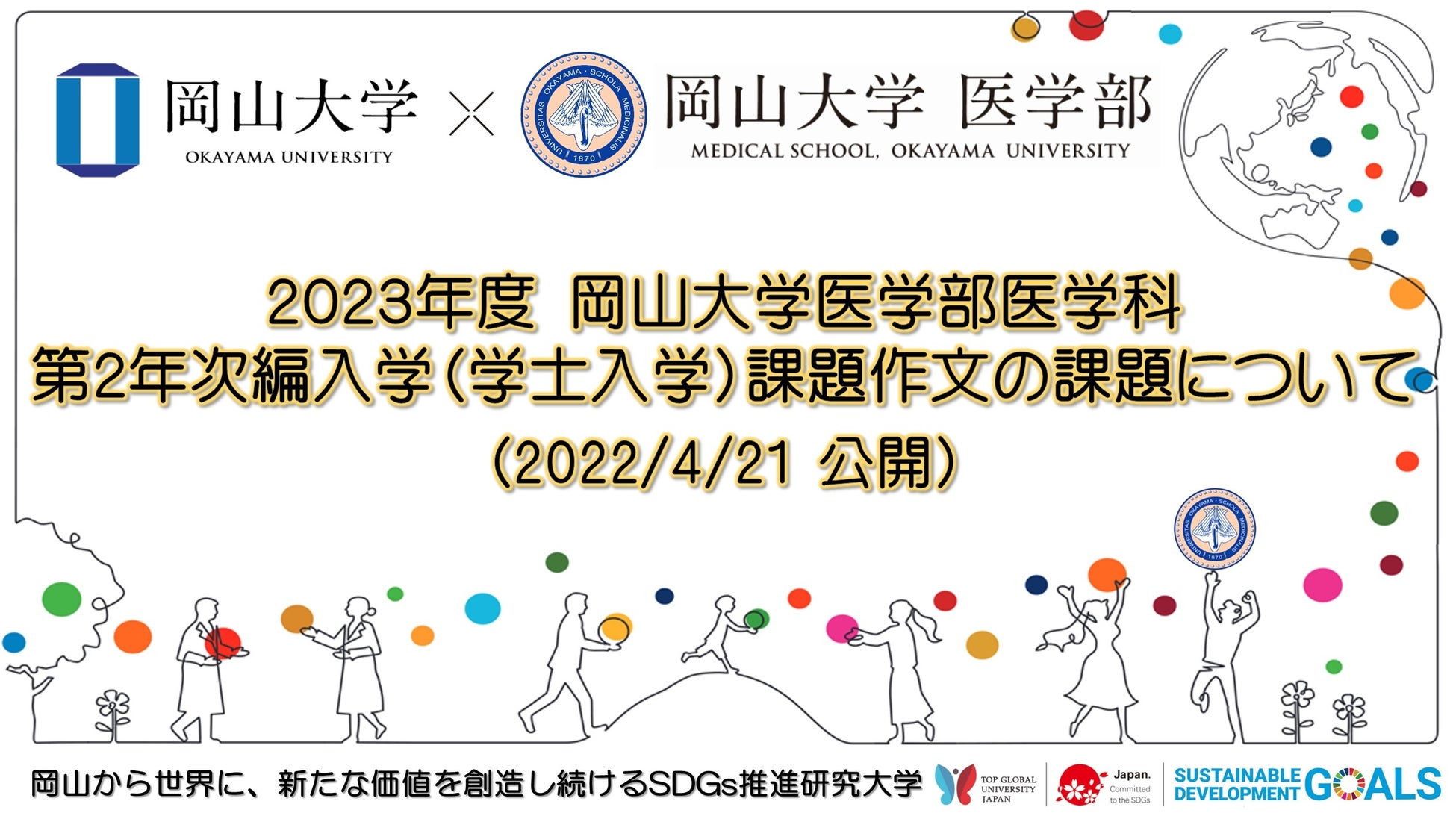 この度、2023年度岡山大学医学部医学科第2年次編入学(学士入学)課題作文の課題について、2022年4月21日に医学科ホームページにて公開しましたので、お知らせいたします。
