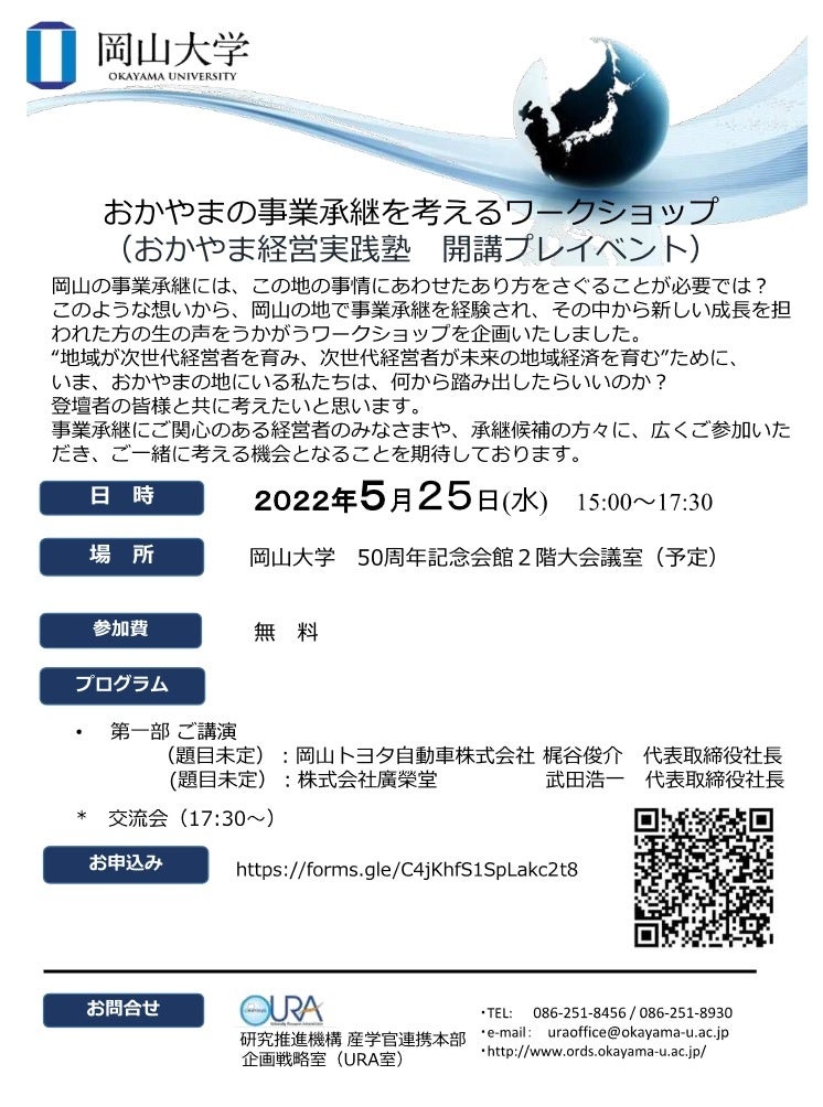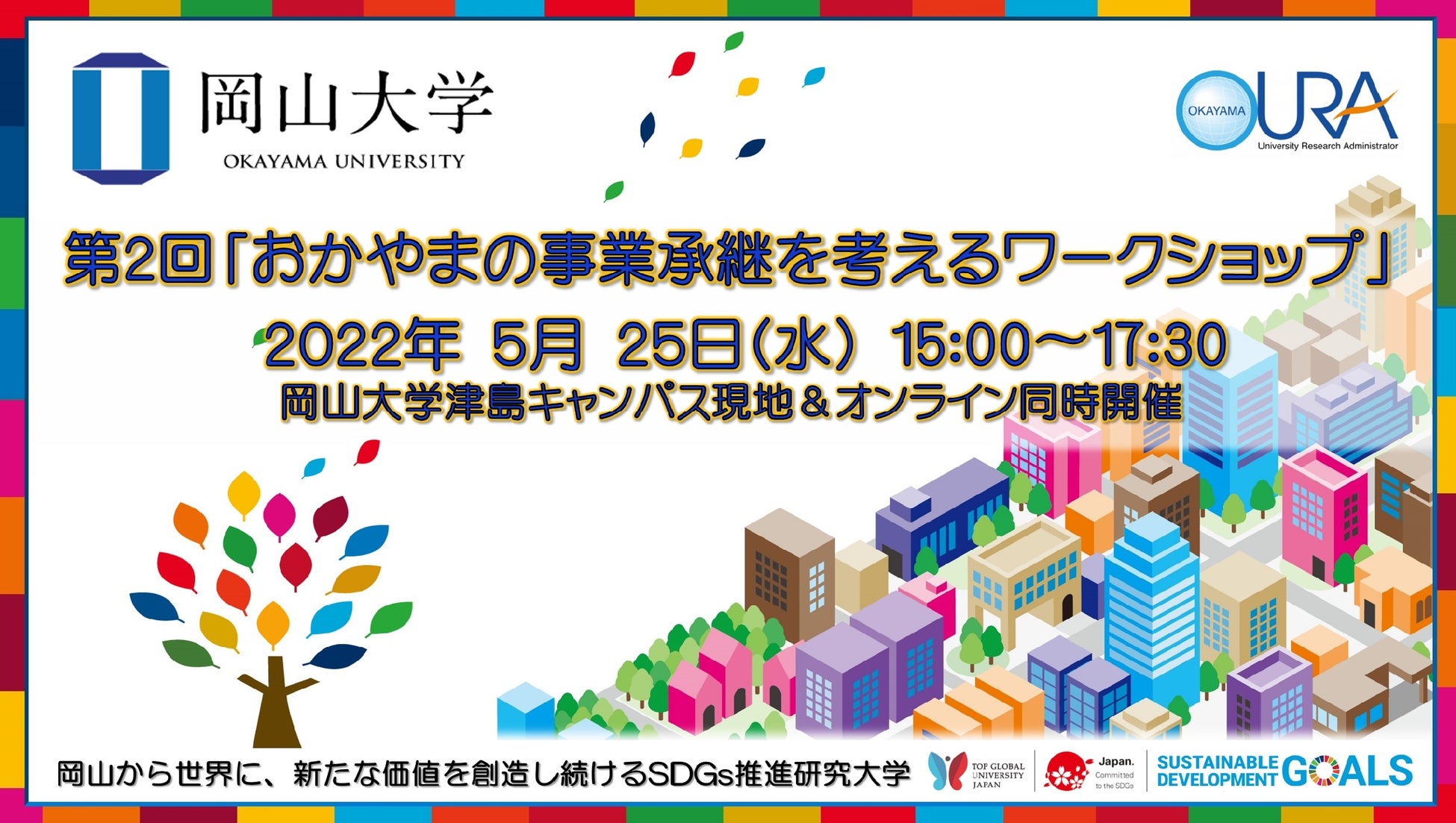 国立大学法人岡山大学(本部:岡山市北区津島中、学長:槇野博史)研究推進機構産学官連携本部及び企画戦略室(URA室)では、2022年5月25日(水)15:00〜17:30に「第2回おかやまの事業承継を考えるワークショップ」を岡山大学津島キャンパスとオンラインの同時開催を実施します。