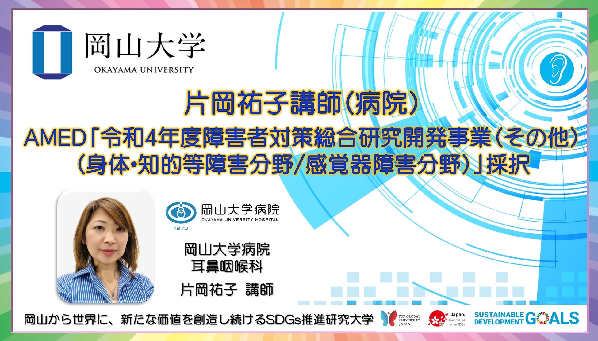 国立大学法人岡山大学(本部:岡山市北区、学長:槇野博史)、岡山大学病院耳鼻咽喉科の片岡祐子講師が、国立研究開発法人日本医療研究開発機構(AMED)の「令和4年度障害者対策総合研究開発事業(その他)(身体・知的等障害分野/感覚器障害分野)」に採択されました。