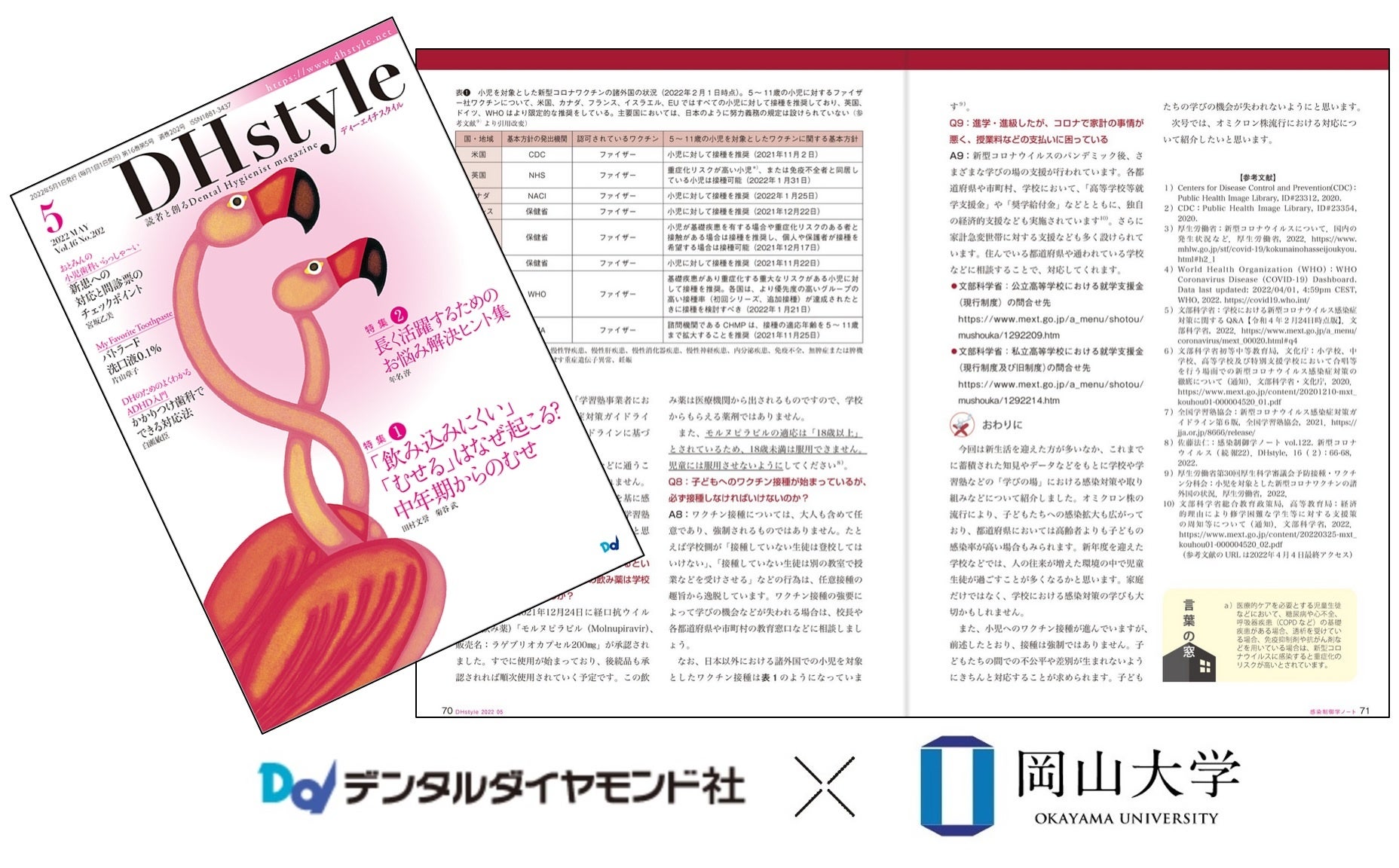 国立大学法人岡山大学(本部:岡山市北区、学長:槇野博史)東京オフィス駐在の佐藤法仁副理事(研究・産学共創担当)・URAは、歯科総合出版社である株式会社デンタルダイヤモンド社(本社:東京都文京区本郷、代表取締役:濵野優)が歯科衛生士向けに発行している月刊誌『DHstyle』に、連載「感染制御学ノート」を2012(平成24)年1月から行っています。
