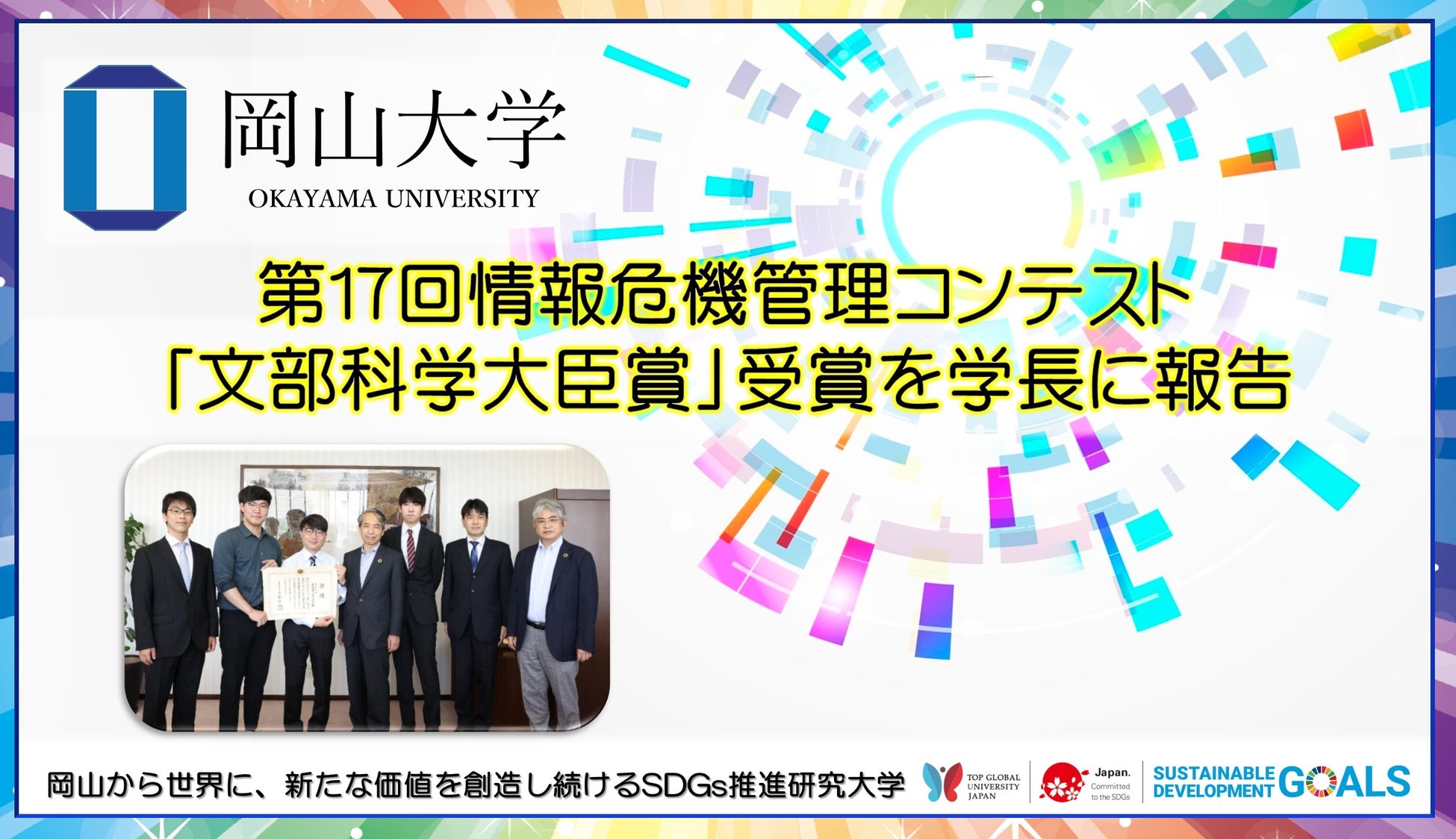 槇野学長からの受賞のお祝いに引き続き、懇談が行われ、槇野学長が第1次~2次の予選を経て決戦に臨んだ時の感想や普段の研究内容、将来の夢などを尋ねました。受賞者からは、今回のコンテストには3チームが参加したこと、予選では質の高いレポートの提出が求められること、決勝戦ではリアルタイムで行われるサーバーへの攻撃に対し、リアルタイムでインシデント対応を繰り返し行ったこと、速さと正確さだけでなく対応力(何が発生し、何が問題かを伝える能力)も審査の対象となることなど説明がありました。