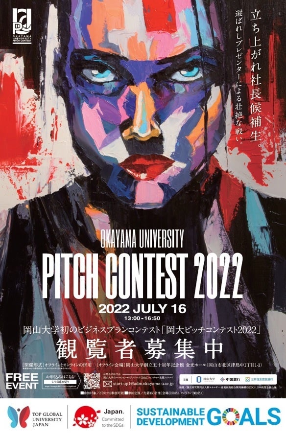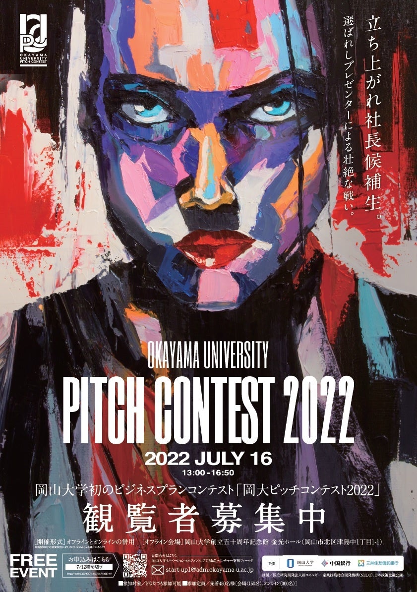 那須保友研究担当理事・副学長)のベンチャー支援フィールドでは、この度、中国銀⾏、三井住友信託銀⾏とともに、学内のアントレプレナーシップ機運の醸成及び起業志望者と起業家・県内企業等との交流を深めることを⽬的に「岡大ピッチコンテスト2022」を、2022年7月16日(土)に現地とオンラインのハイブリッドで開催します。