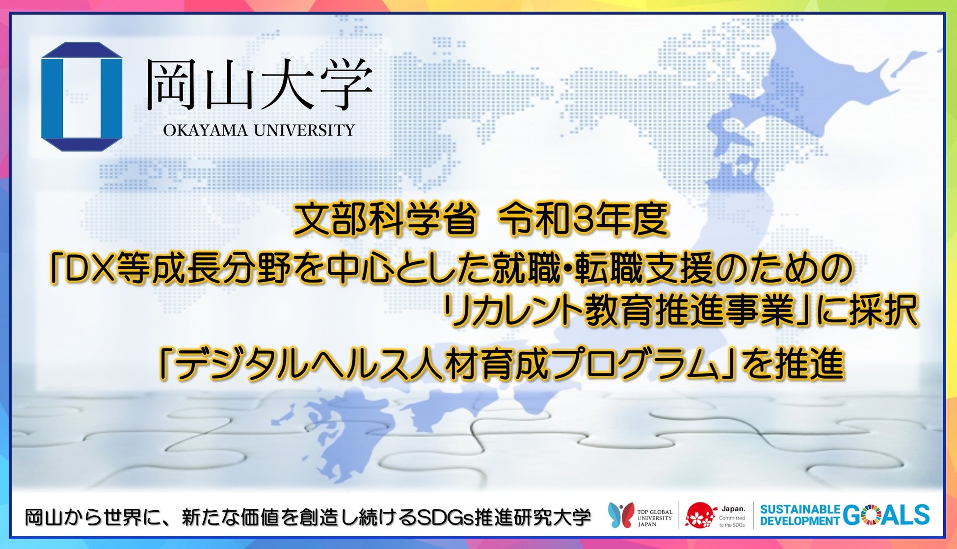 国立大学法人岡山大学(本部:岡山市北区、学長:槇野博史)が企画・構想している「デジタルヘルス人材育成プログラム」が、文部科学省令和3年度「DX等成長分野を中心とした就職・転職支援のためのリカレント教育推進事業」における「DX分野等リスキルプログラムの開発・実施」の枠組みで採択されました(2022年6月20日採択結果公表)。
