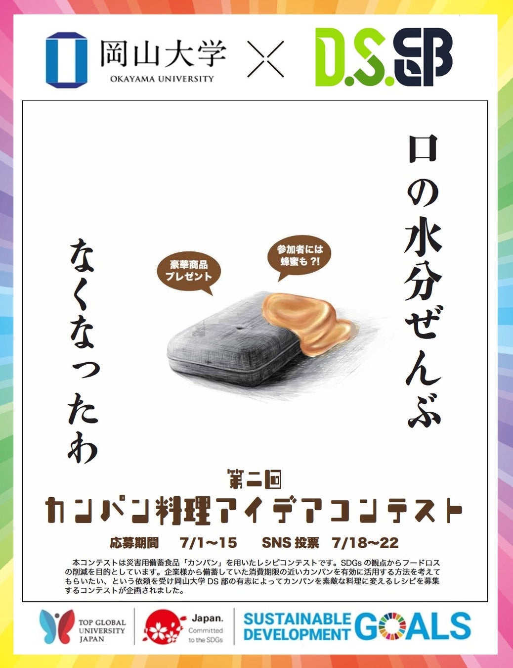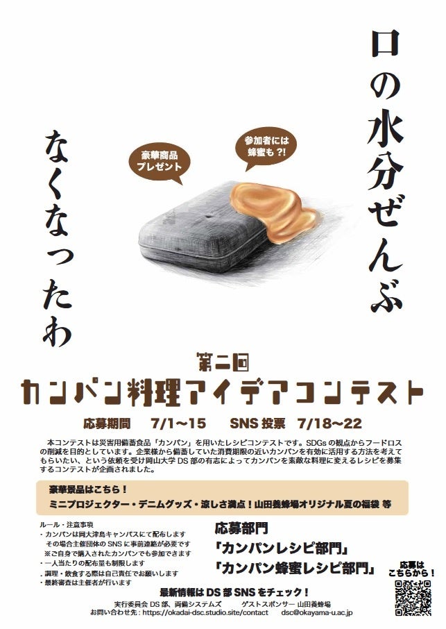 この度、株式会社両備システムズより、賞味期限が残り1年弱となった備蓄用の「カンパン(保存用ビスケット)」をご提供いただき、加えて株式会社山田養蜂場より蜂蜜をご提供いただいて、岡山大学DS(データサイエンス) 部の有志によって、カンパンを素敵な料理に変える「第2回カンパン料理アイデアコンテスト」を企画・開催します。