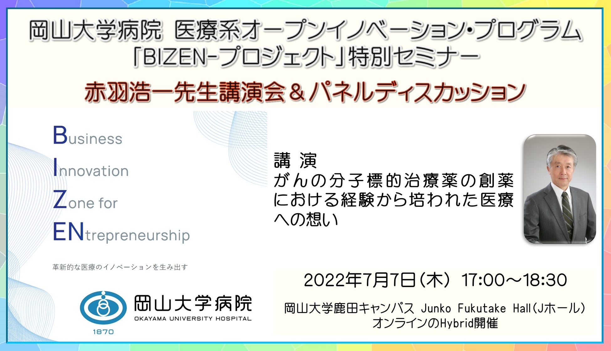 今回、2022年7月7日(木)に我が国のがん分子標的薬開発の中心となって活躍されてきました赤羽浩一先生を岡山大学鹿田キャンパスのJunko