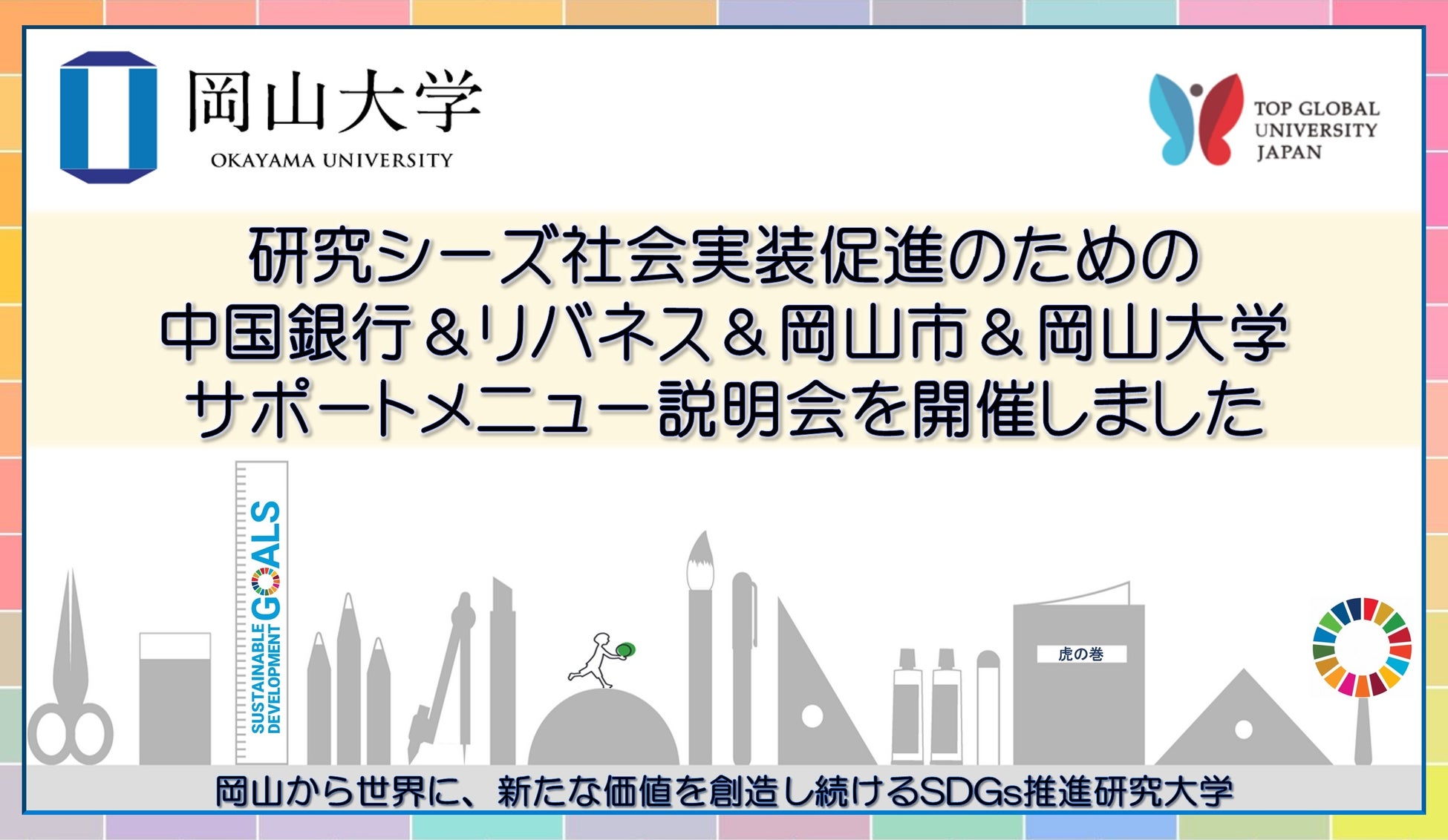 国立大学法人岡山大学(本部:岡山市北区、学長:槇野博史)は、「研究シーズ社会実装促進のための中国銀行&リバネス&岡山市&岡山大学サポートメニュー説明会」を岡山駅前の「ももたろう・スタートアップカフェ」(ももスタ)で開催しました。オンラインを併用し、学生・教職員・一般の方40人が会場及びオンラインで参加しました。