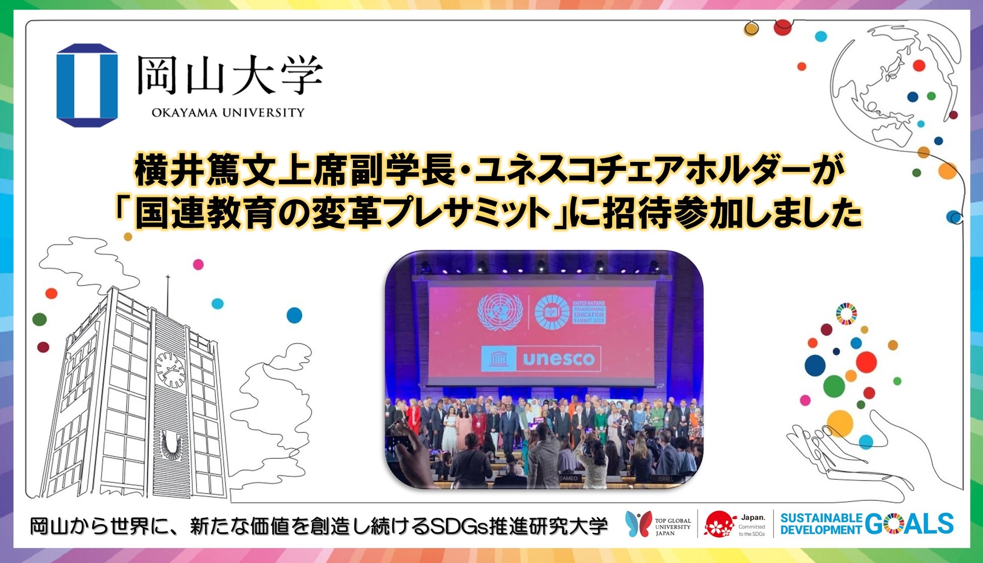 2022年6月28日~30日、「国連教育の変革プレサミット」がフランス・パリにある国連教育科学文化機関(UNESCO)の本部で開催され、岡山大学から横井篤文上席副学長(特命(グローバル・エンゲージメント戦略)担当)・ユネスコチェアホルダーが現地にて招待参加しました。本プレサミットは、第77回国連総会(場所:国連本部、米ニューヨーク)会期中の9月19日にアントニオ・グテーレス国連事務総長が2021年に公表した「私たちの共通のアジェンダ(Our