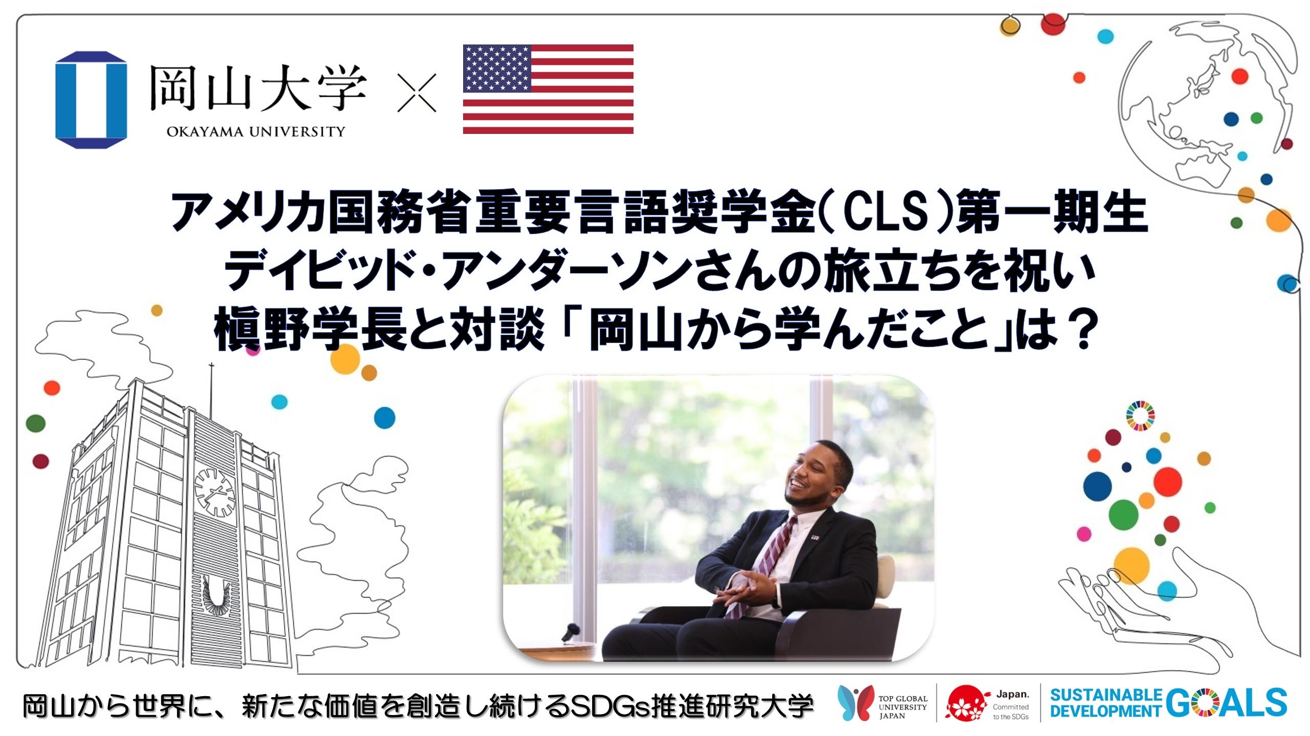 米国務省重要言語奨学金(CLS)プログラムの第一期生であり、本学社会文化科学研究科の研究生として学ぶデイビッド・アンダーソンさんが、この度ハーバード大学に進学することになりました。2022年7月1日、槇野博史学長に帰国にあたってのお礼の表敬訪問をした際に、対談を行いました。