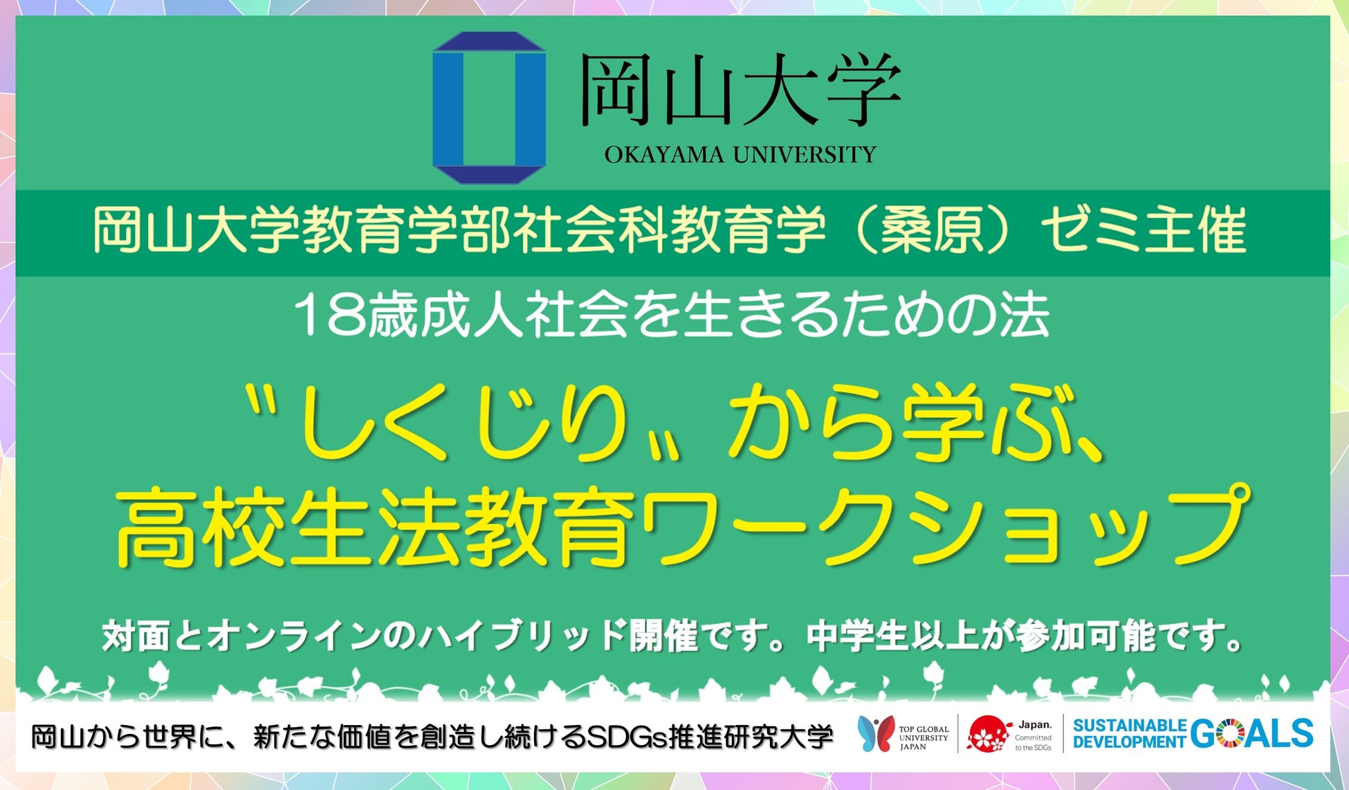 国立大学法人岡山大学(本部:岡山市北区、学長:槇野博史)の大学院教育学研究科では、教育科学専攻の大学院生宮本あゆはさんが企画した高校生対象の法教育ワークショップ「18歳成人社会を生きるための法〝しくじり〟から学ぶ、高校生法教育ワークショップ」を2022年8月28日(日)に岡山大学教育学部(岡山市北区)で開催します。今回は、対面とオンラインのハイブリッド開催です。