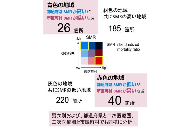 - 2009〜2018年の自殺統計資料から自殺の割合の高低を数値化し、政策単位(市町村、二次医療圏、都道府県)間の見え方の違いを検証し、都道府県単位のみで評価すると見落としかねない自殺の多い/少ない地域を明らかにした。