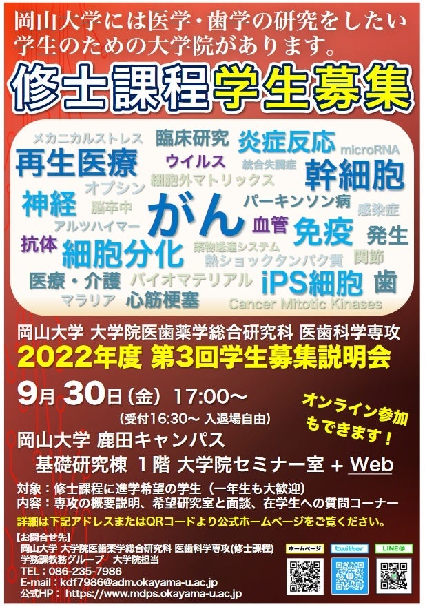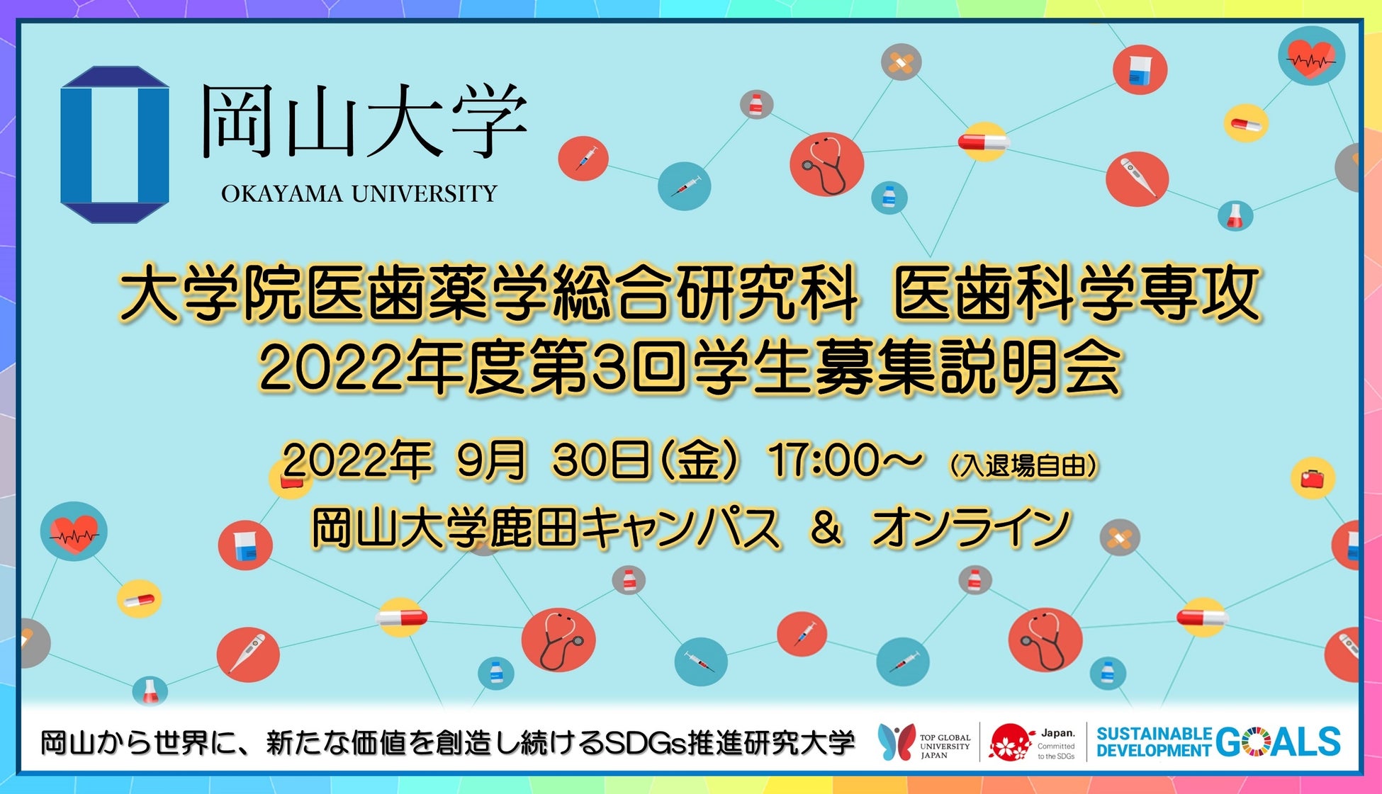 国立大学法人岡山大学(本部:岡山市北区、学長:槇野博史)大学院医歯薬学総合研究科・医歯科学専攻(修士課程)では、2022年9月30日(金)17:00から「2022年度第3回学生募集説明会」を本学鹿田キャンパス(岡山市北区)での現地開催とオンライン開催の同時にて実施します。