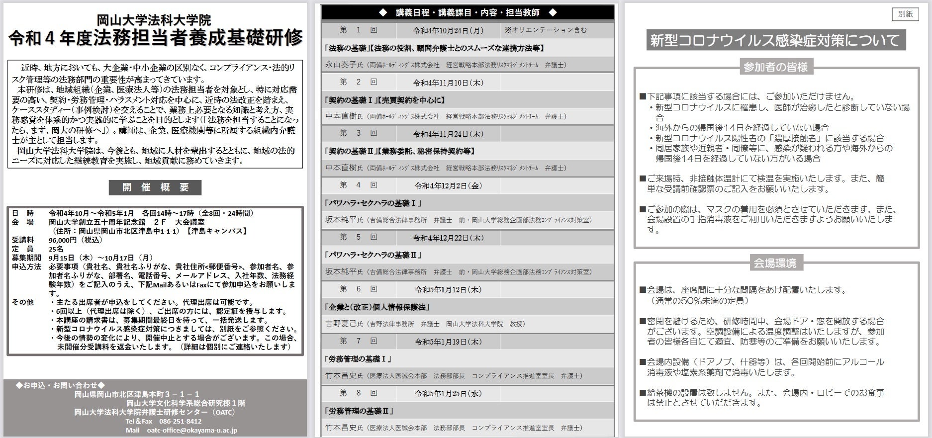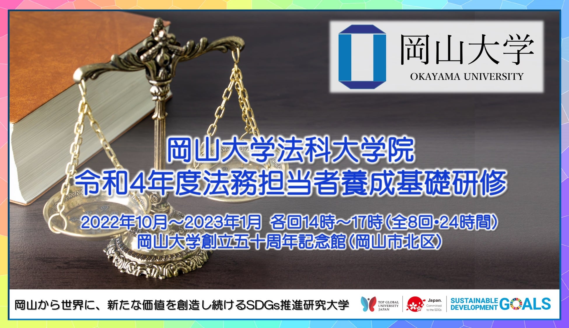 今回、岡山大学法科大学院では、「令和4年度法務担当者養成基礎研修」を2022年10月~2023年1月までの期間に全8回の日程で、本学津島キャンパスの岡山大学創立五十周年記念館(岡山市北区)で開催します。