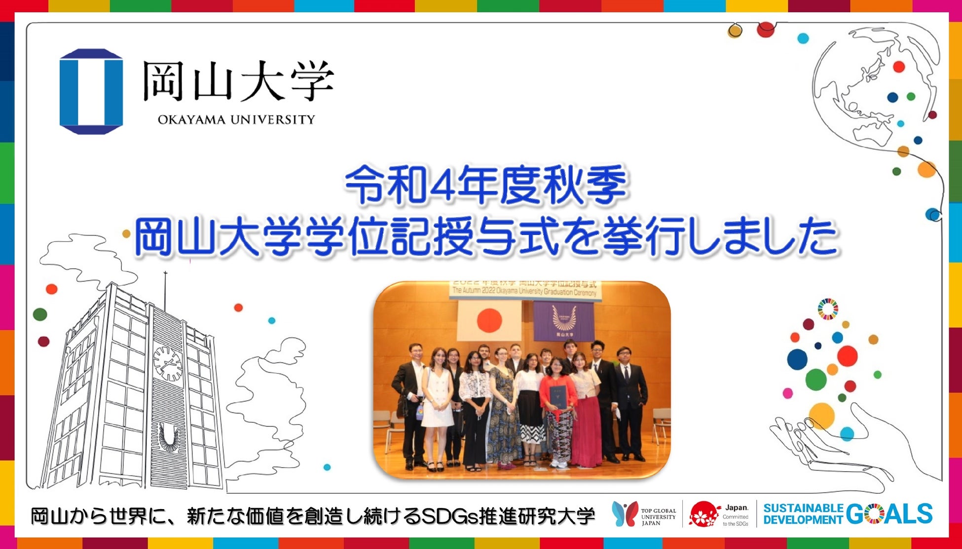 future.(私たちは、皆さんが岡山大学で学んだこと、そしてそれぞれの学位を取得して成し遂げたことを誇りに思ってほしいと思っています。皆さんの今後のご活躍、ご健康、そしてご多幸をお祈りいたします。)」と卒業生にメッセージを送りました。