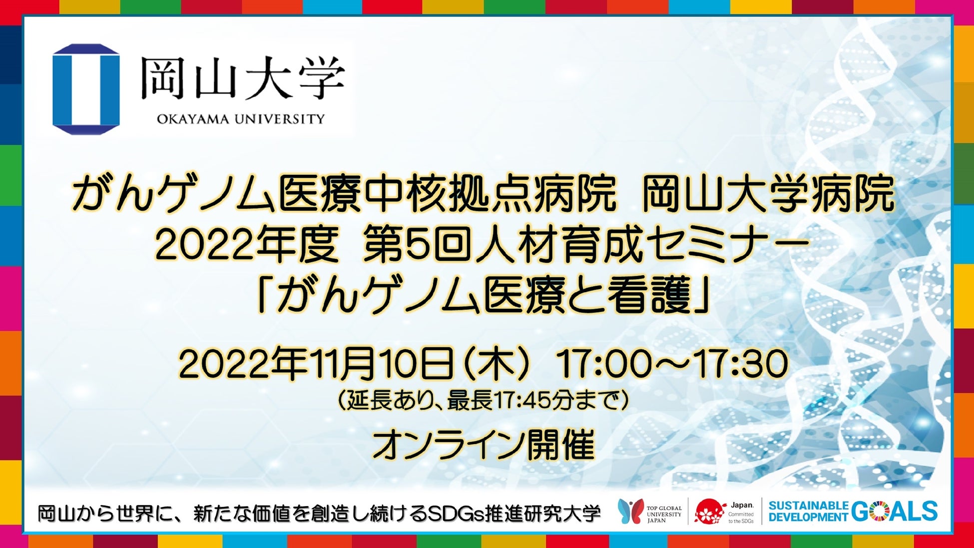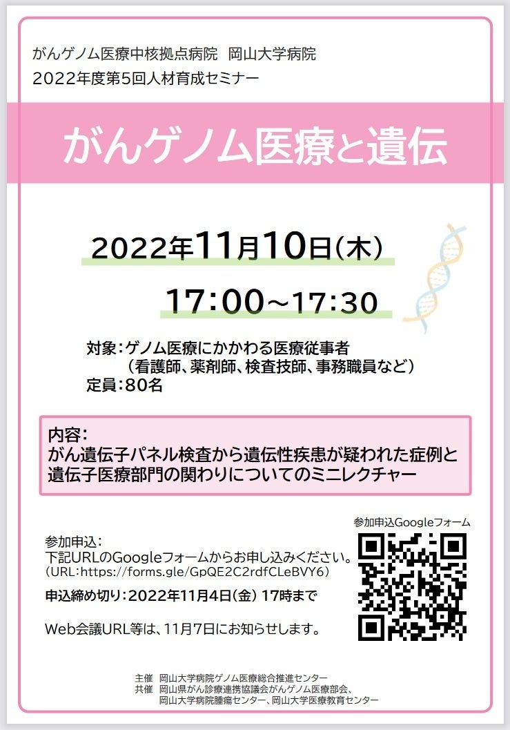 今回、看護師やがん看護に携わる看護師を対象として、がんゲノム医療中核拠点病院 岡山大学病院 2022年度第5回人材育成セミナー「がんゲノム医療と看護 オンライン事例検討会」を、2022年11月10日(木)にオンラインで開催することとなりました。