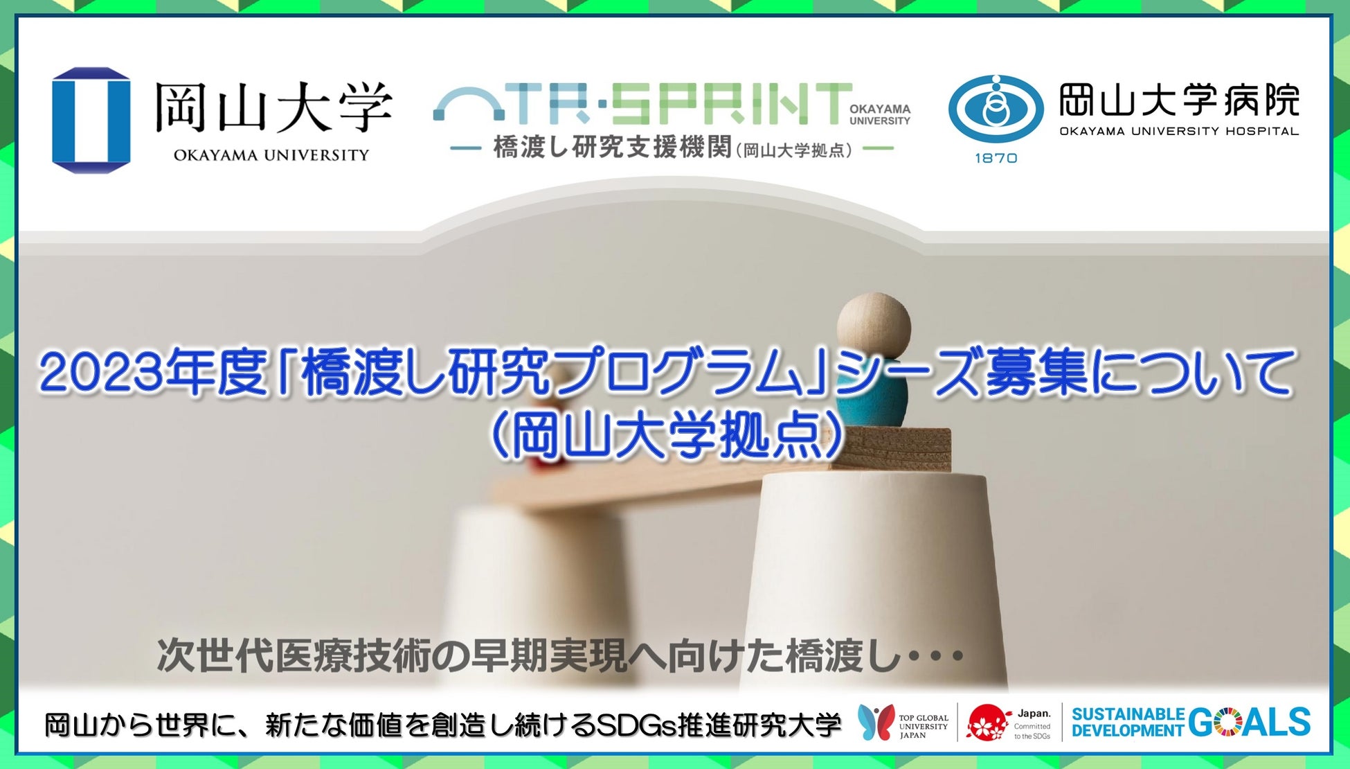 ・【岡山大学】2023年度「橋渡し研究プログラム(岡山大学拠点)」オンライン公募説明会〔8/29,31 オンライン〕