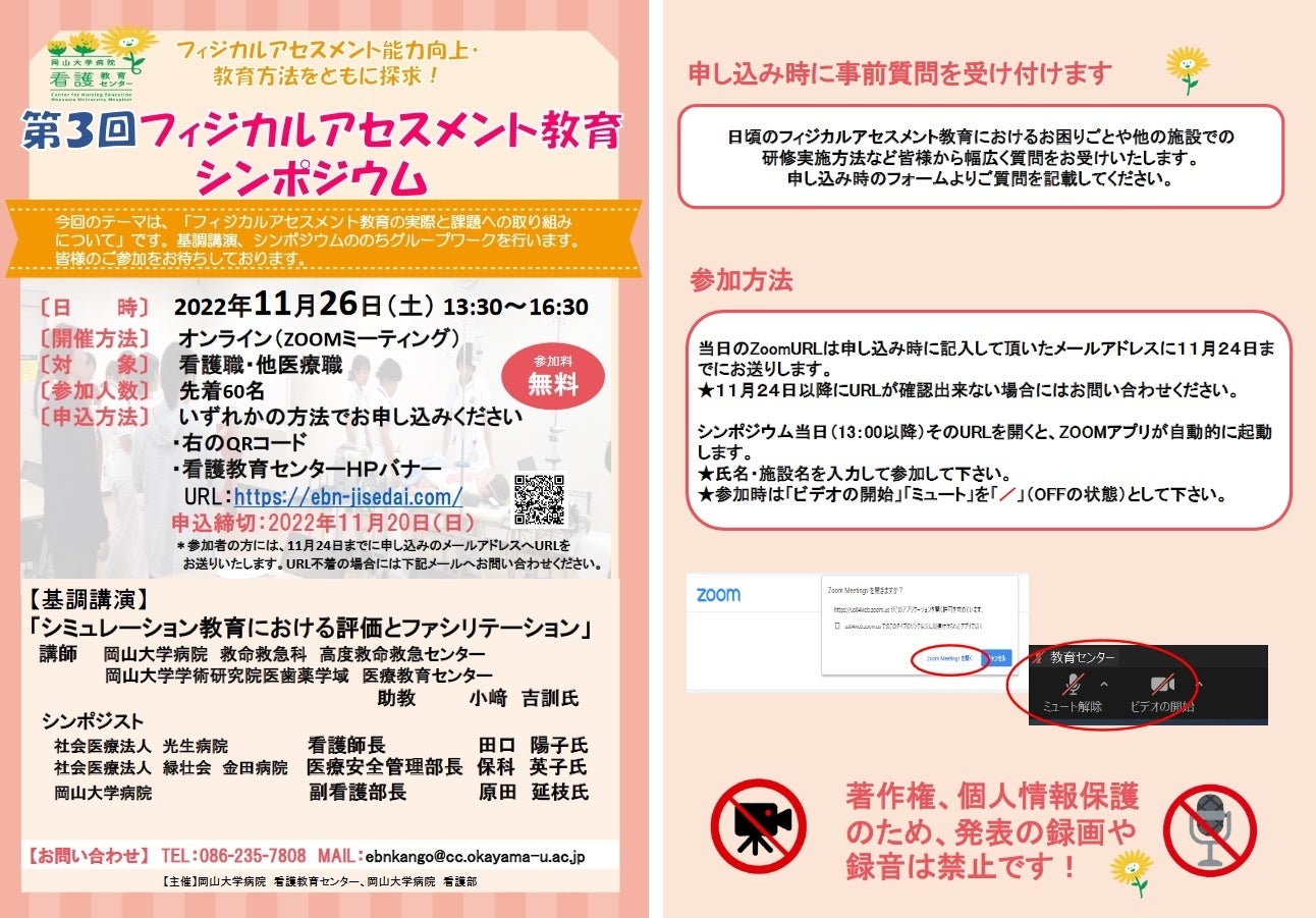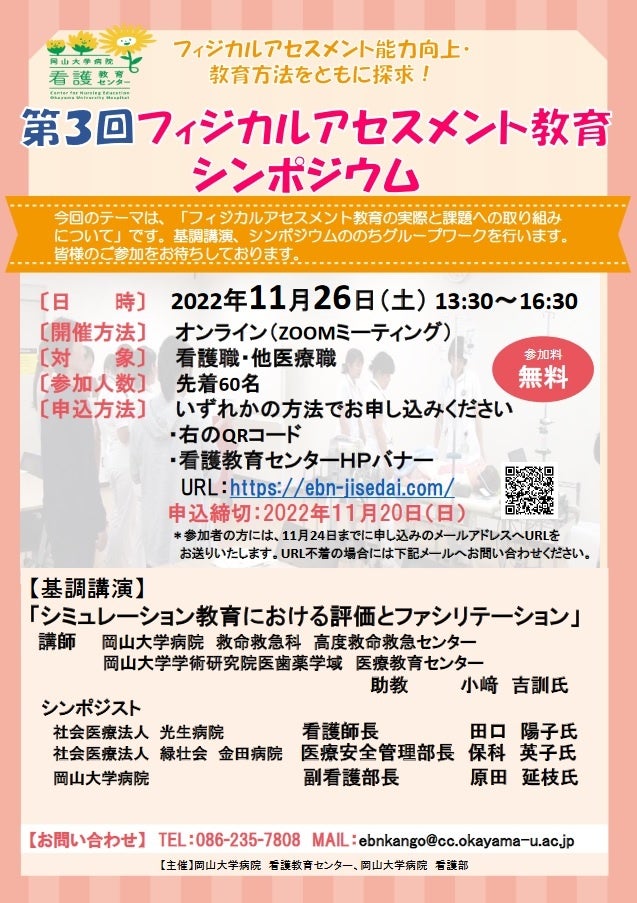 国立大学法人岡山大学(本部:岡山市北区、学長:槇野博史)の岡山大学病院看護教育センターでは、2022年11月26日(土)13時30分から、「第3回フィジカルアセスメント教育シンポジウム」をオンライン形式で開催いたします。