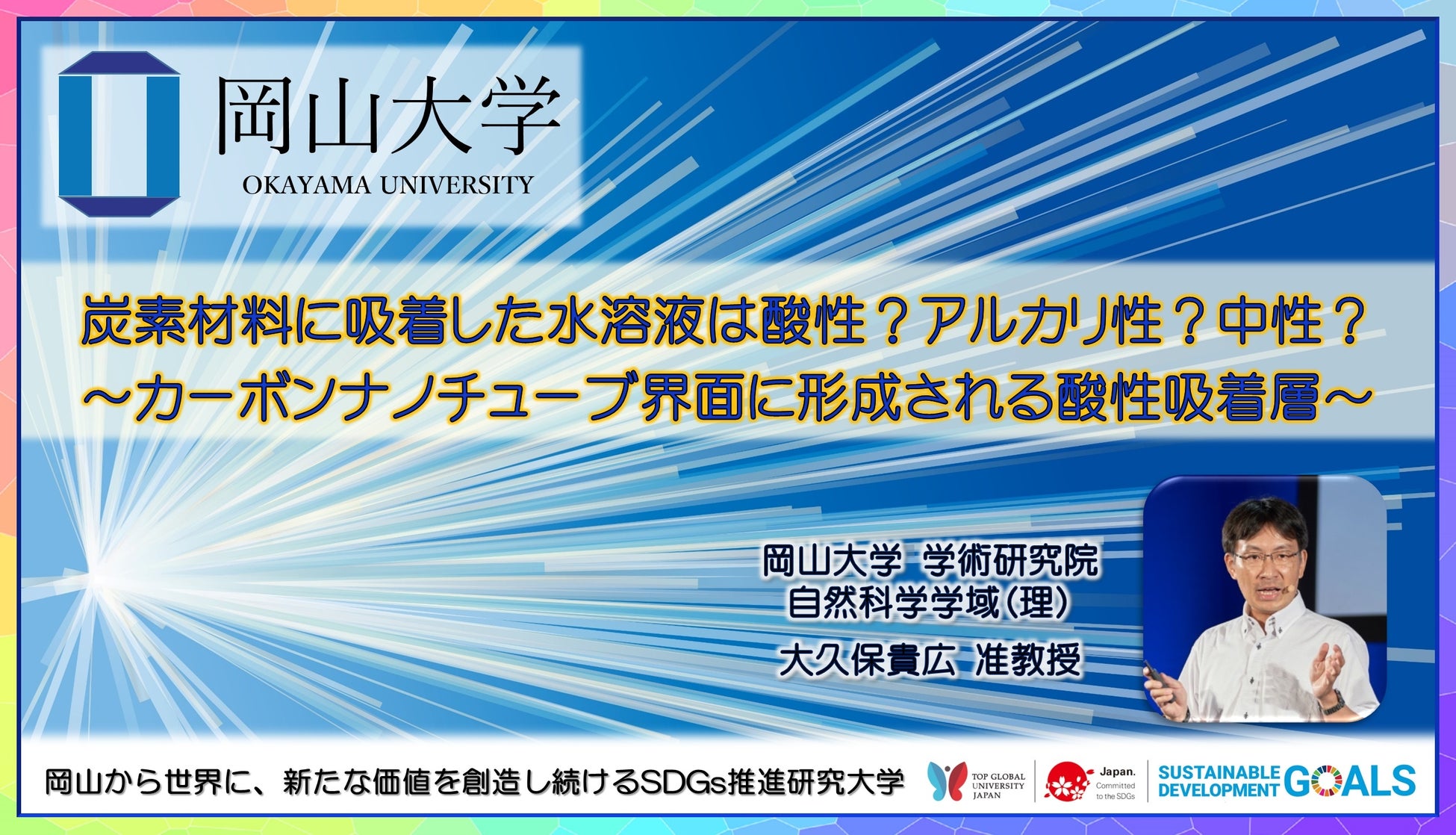 国立大学法人岡山大学(本部:岡山市北区、学長:槇野博史)の学術研究院自然科学学域(理)の大久保貴広准教授、武安伸幸准教授らの共同研究グループは、カーボンナノチューブに水溶液を吸着させた後の状態を分光学的に調べ、カーボンナノチューブと水溶液との界面に強酸性の吸着層が形成されていることを発見しました。