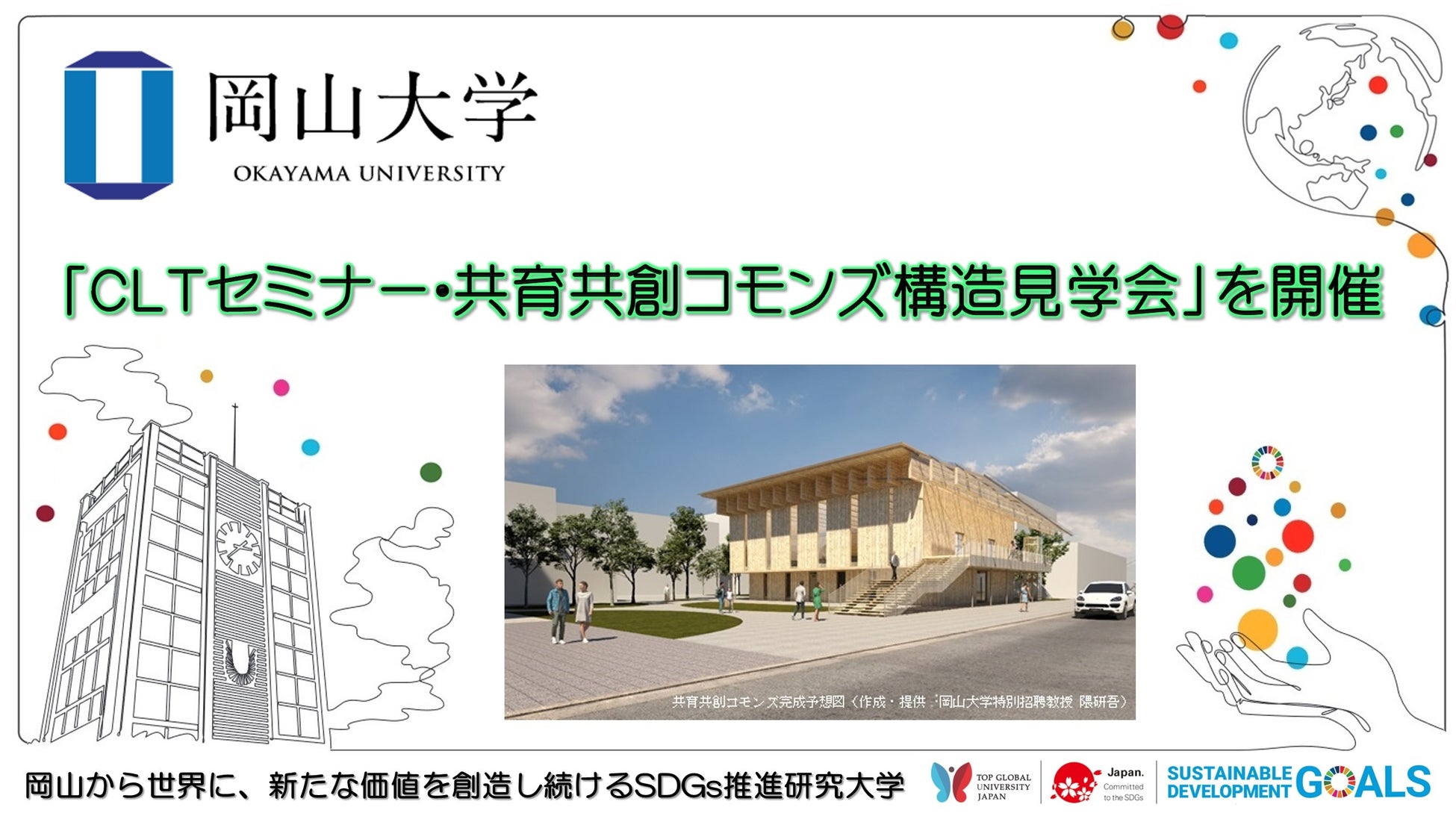 2022年9月26日、岡山市、真庭市が主催する岡山連携中枢都市圏事業として「CLTセミナー・共育共創コモンズ構造見学会」が、一般社団法人日本CLT協会、国立大学法人岡山大学、清水建設株式会社の協力により岡山大学津島キャンパス(岡山市北区)の自然科学研究科棟大講義室で開催され、本学の教職員、学生のほか、他大学、岡山県、市町村職員、建築関係者など、約80人が参加しました。