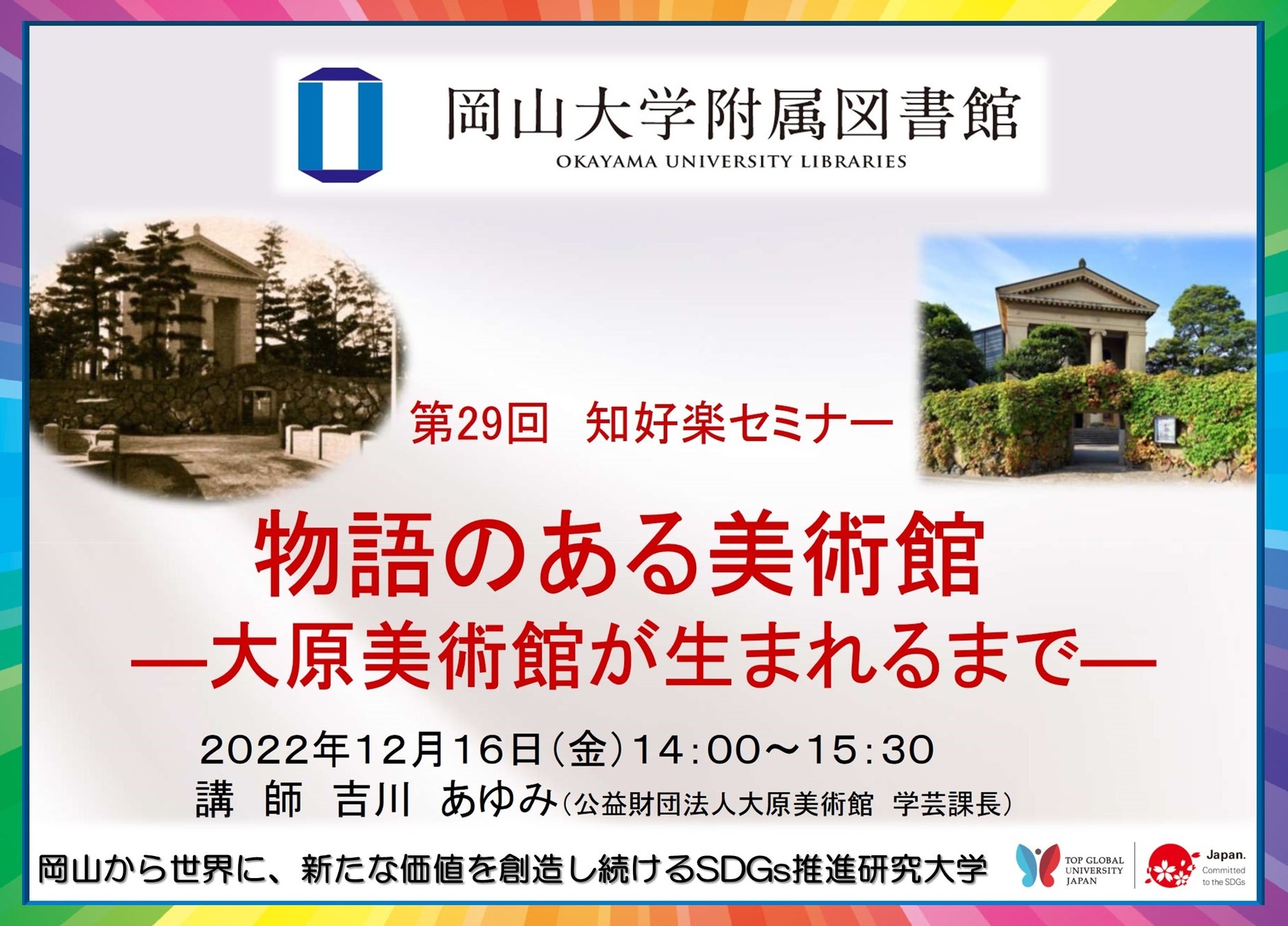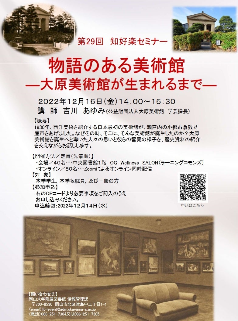 国立大学法人岡山大学(本部:岡山市北区、学長:槇野博史)の附属図書館では、第29回知好楽セミナー「物語のある美術館―大原美術館が生まれるまで―」を開催します。