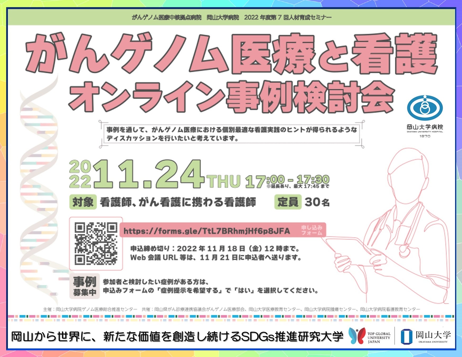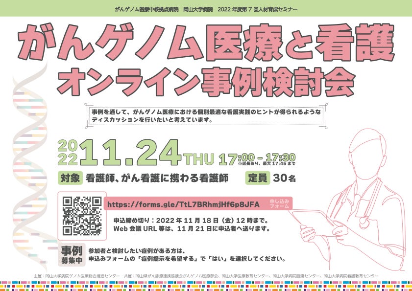 今回、看護師やがん看護に携わる看護師を対象として、がんゲノム医療中核拠点病院 岡山大学病院 2022年度第7回人材育成セミナー「がんゲノム医療と看護 オンライン事例検討会」を、2022年11月24日(木)にオンラインで開催することとなりました。