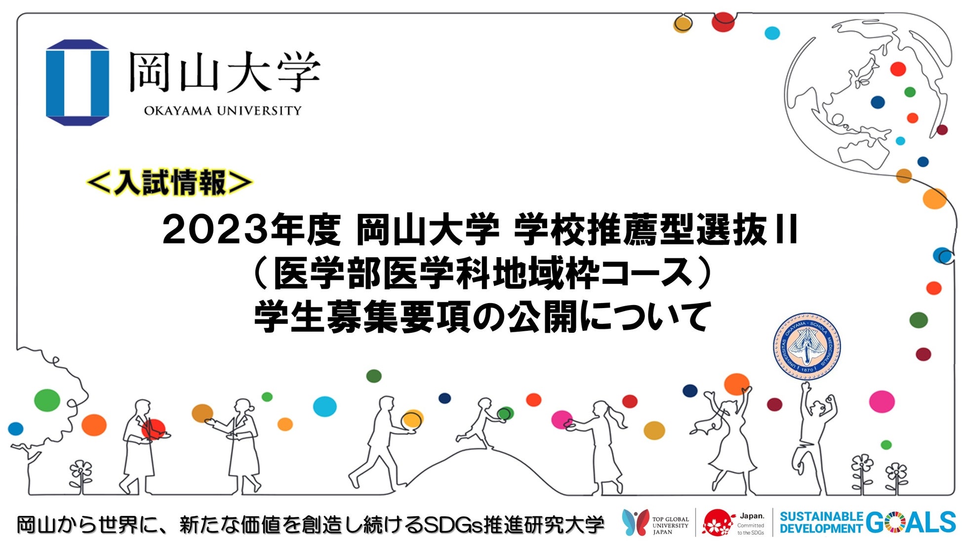 国立大学法人岡山大学(本部:岡山市北区津島中、学長:槇野博史)では、2023年度岡山大学学校推薦型選抜II(医学部医学科地域枠コース)学生募集要項について、以下の通り公開しましたので、お知らせします。