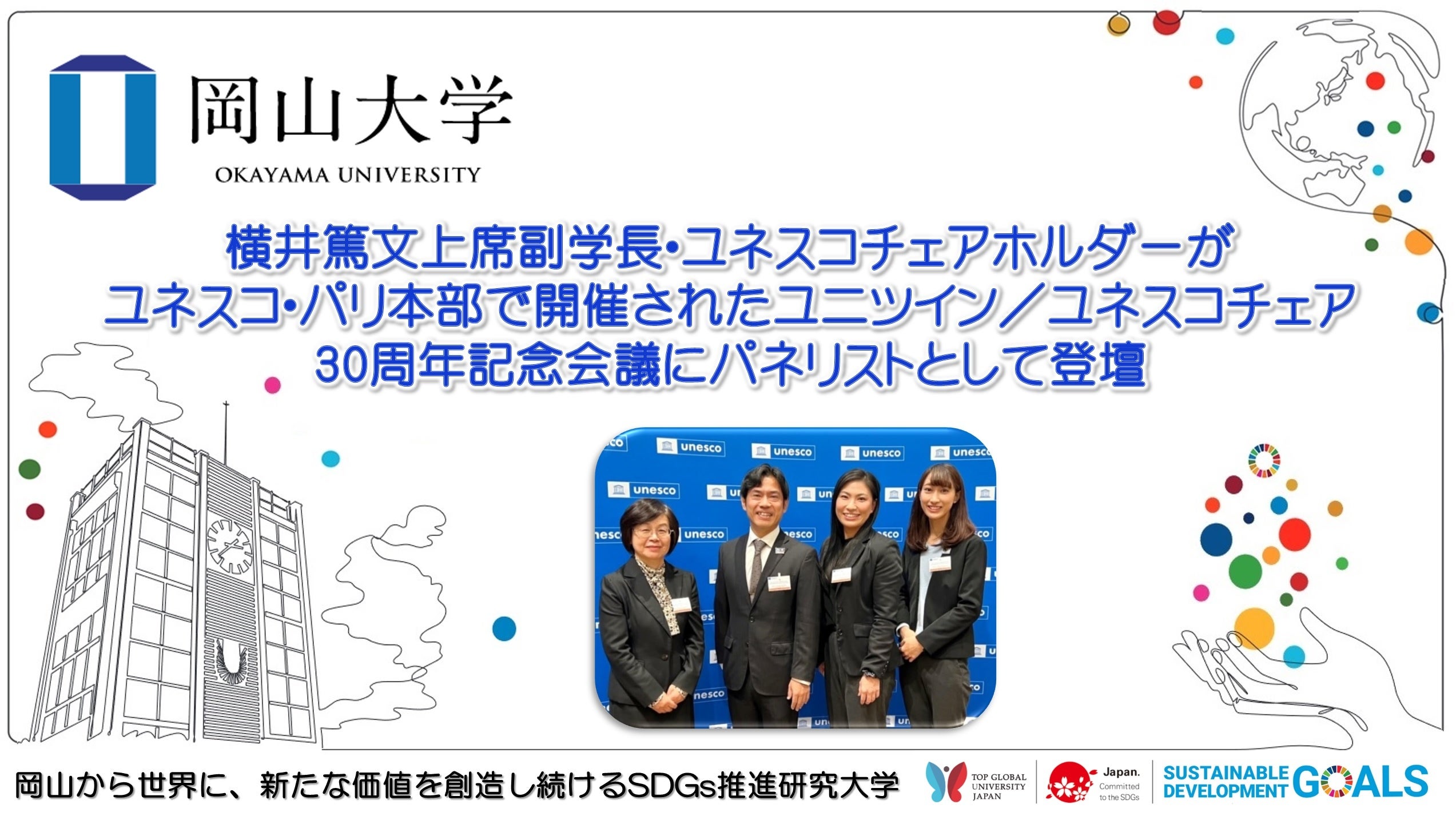 2022年11月3~4日、「ユニツイン/ユネスコチェア30周年記念会議(The 30th Anniversary Conference of the UNITWIN/UNESCO Chairs Programme)」がフランス・パリにある国連教育科学文化機関(UNESCO)の本部で開催され、岡山大学から横井篤文上席副学長(特命(グローバル・エンゲージメント戦略)担当)・ユネスコチェアホルダーらが現地にて招待参加し、パネリストとして登壇しました。