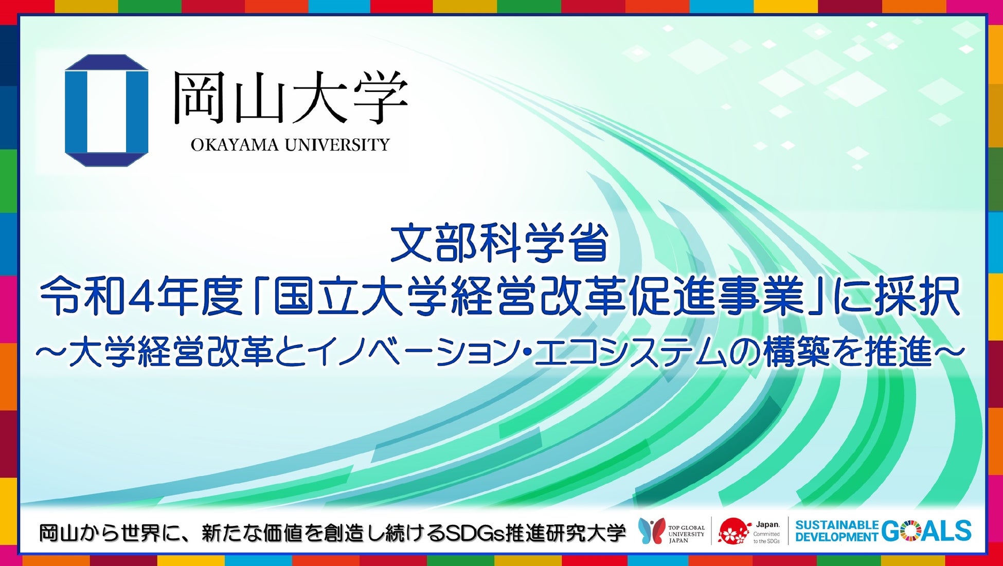 ・【岡山大学】文部科学省令和3年度「国立大学経営改革促進事業」に採択 ~イノベーション・エコシステム構築に向けた大学収入構造改革を推進~