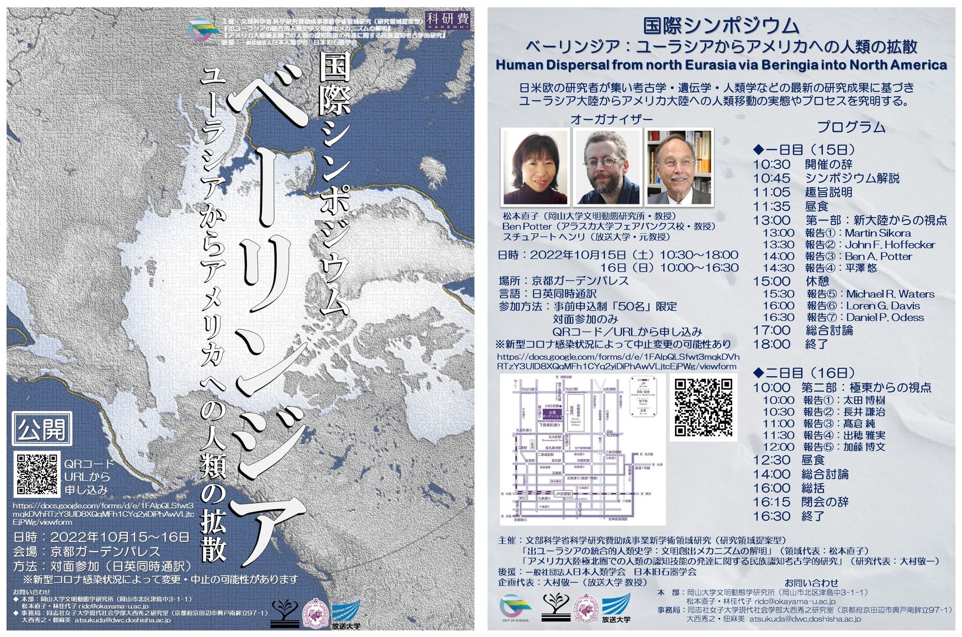 国立大学法人岡山大学(本部:岡山市北区、学長:槇野博史)の文明動態学研究所(RIDC)は、2022年10月15、16日に日米欧の研究者が集い考古学・遺伝学・人類学などの最新の研究成果に基づき、ユーラシア大陸からアメリカ大陸への人類移動の実態やプロセスを究明する国際シンポジウム「ベーリンジア:ユーラシアからアメリカへの人類の拡散」を京都ガーデンパレス(京都市上京区)で開催しました。