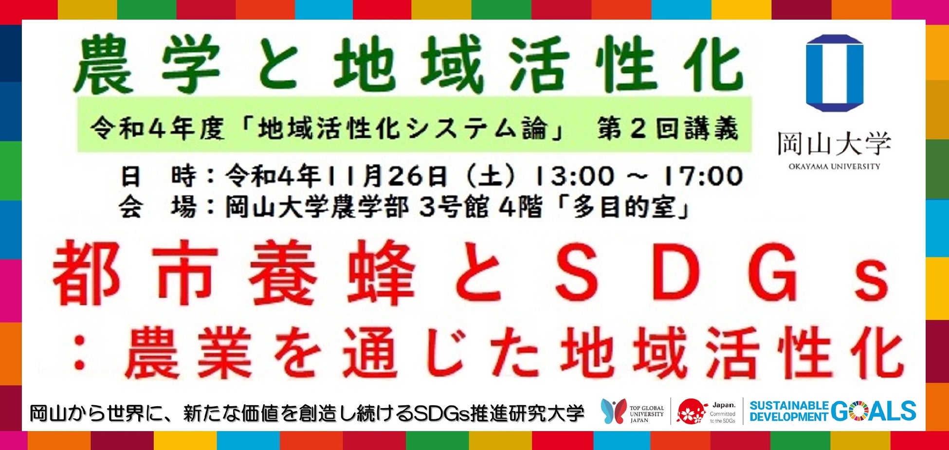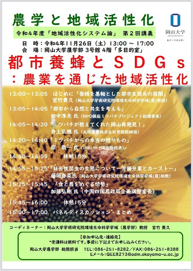 国立大学法人岡山大学(本部:岡山市北区、学長:槇野博史)の農学部は、地域活性化に農学がいかにかかわるべきかについて、産学官の各分野から農学による地域活性化に取り組む講師を迎え、特別講義を開催します。