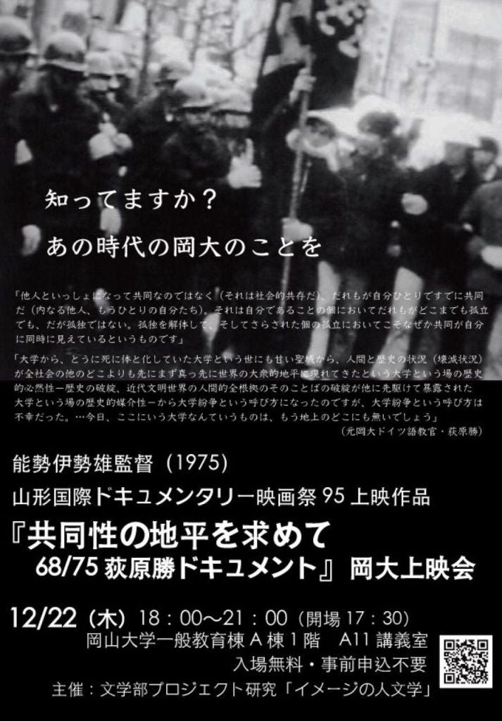 今回、ドキュメンタリー映画「共同性の地平を求めて」上映会+監督トークを、2022年12月22日(木)18:00~21:00に岡山大学津島キャンパスの岡山大学一般教育棟にて開催します。