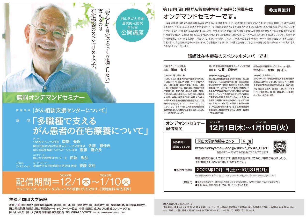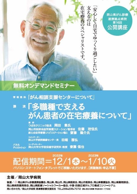 国立大学法人岡山大学(本部:岡山市北区、学長:槇野博史)の岡山大学病院が主催して、第16回岡山県がん診療連携拠点病院市民公開講座「多職種で支えるがん患者の在宅療養について」の開催オンデマンド配信を2022年12月1日(木)~2023年年1月10日(火)に実施しています。