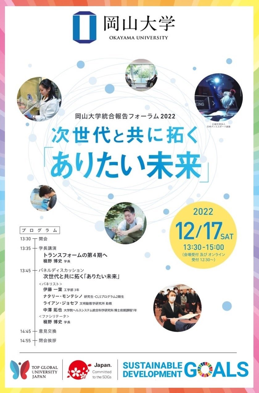 今回、統合報告書2022の発行に伴い、学内外のステークホルダーの皆様と対話を進めるため、「岡山大学統合報告フォーラム2022」を、2022年12月17日(土)に現地とオンラインのハイブリッドで開催いたします。