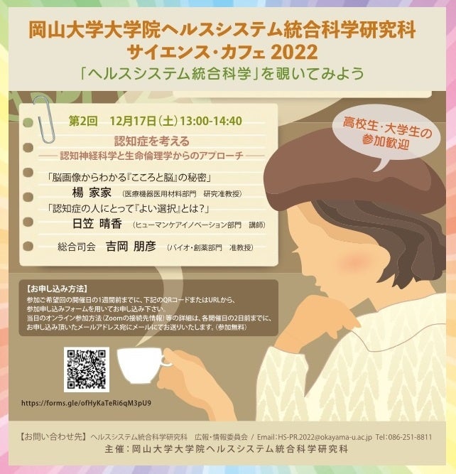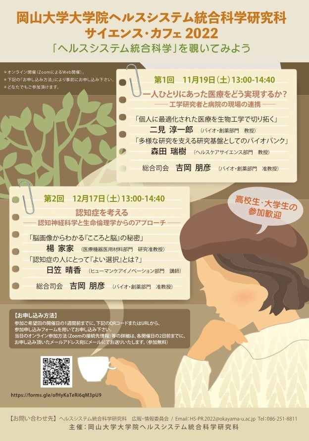 国立大学法人岡山大学(本部:岡山市北区、学長:槇野博史)の大学院ヘルスシステム統合科学研究科では、"「ヘルスシステム統合科学」を覗いてみよう"をテーマに2回のサイエンス・カフェをオンライン(zoom)で開催します。