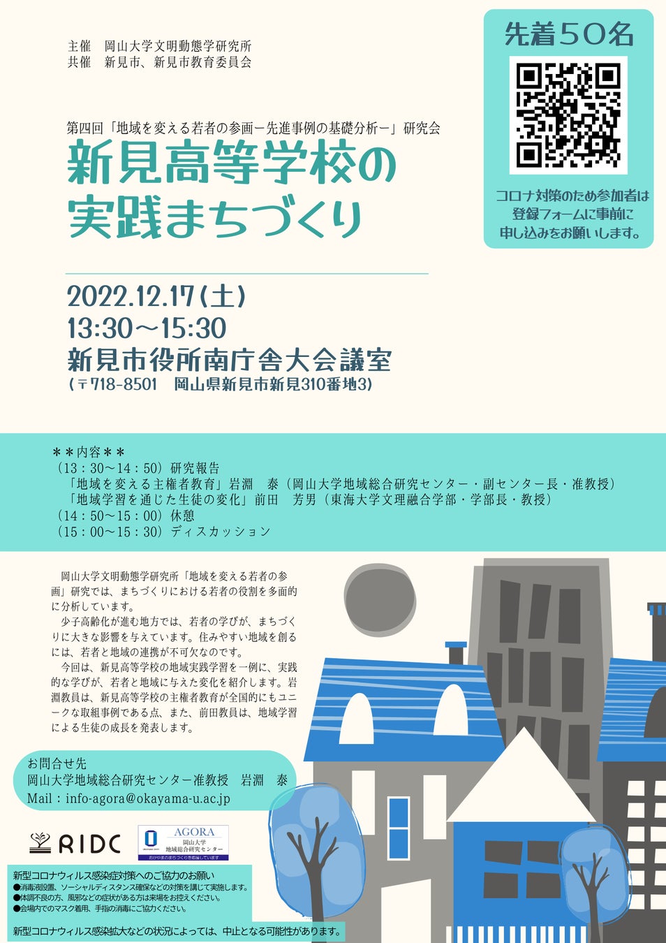 国立大学法人岡山大学(本部:岡山市北区、学長:槇野博史)の岡山大学文明動態学研究所「地域を変える若者の参画」研究では、まちづくリにおける若者の役割を多面的に分析しています。