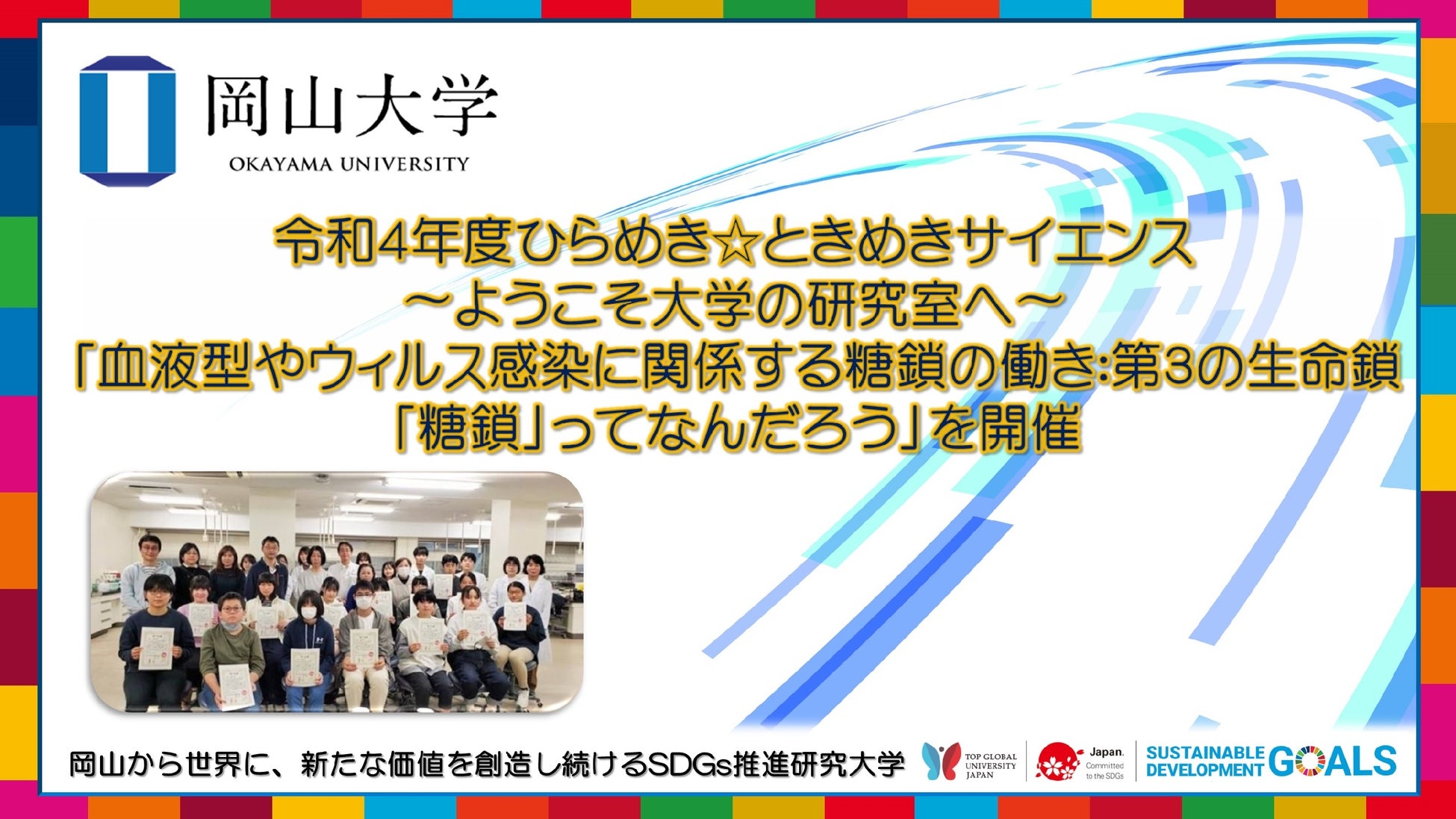 国立大学法人岡山大学(本部:岡山市北区、学長:槇野博史)の農学部は、令和4年度 ひらめき☆ときめきサイエンス~ようこそ大学の研究室へ~「血液型やウィルス感染に関係する糖鎖の働き:第3の生命鎖「糖鎖」って何だろう」を2022年11月5日(土)に岡山大学津島キャンパスの農学部で開催しました。