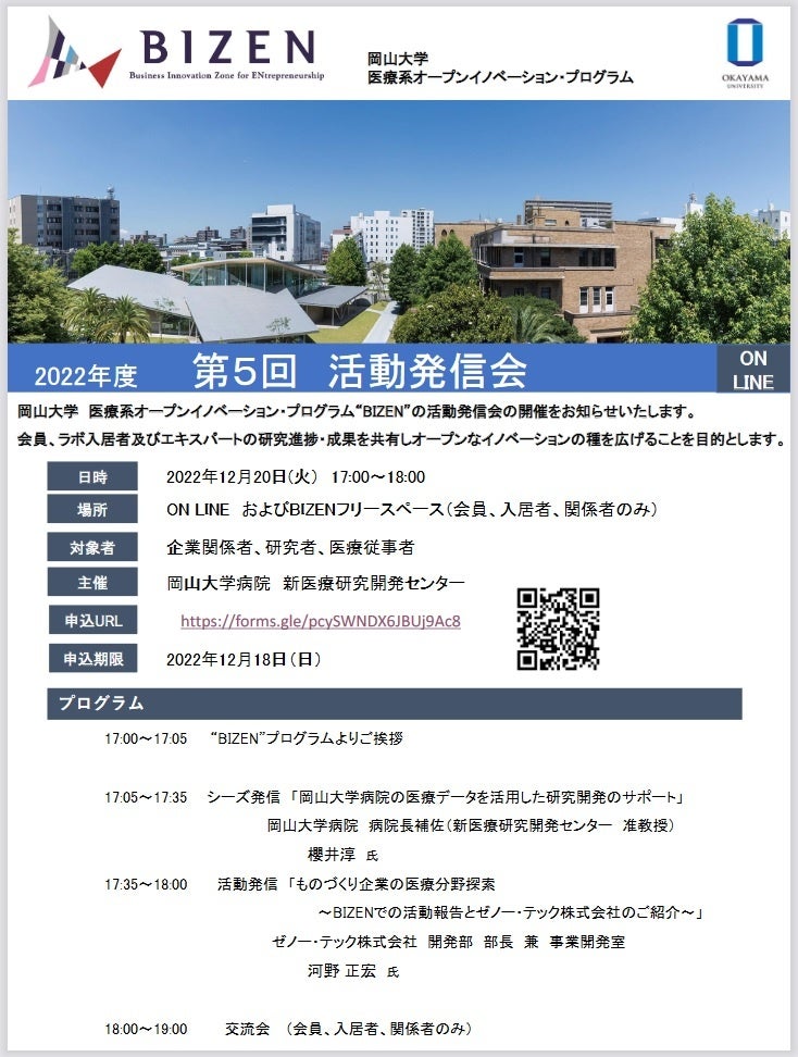 今回、岡山大学病院でのオープンイノベーション活動に興味・関心のある企業、もしくは入会・入居を検討中の企業へBIZENラボ入居者、BIZEN会員およびエキスパートの研究進捗・成果を共有し、オープンなイノベーションの種を広げることを目的とし、「第5回BIZEN活動発信会」を、2022年12月20日(火)に開催します。