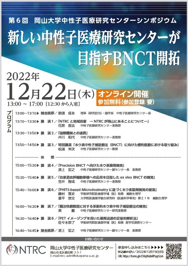 国立大学法人岡山大学(本部:岡山市北区、学長:槇野博史)の中性子医療研究センターでは、「第6回岡山大学中性子医療研究センターシンポジウム ~新しい中性子医療研究センターが目指すBNCT開拓~」を2022年12月22日(木)13:00~17:00に、zoomによるオンラインで開催します。