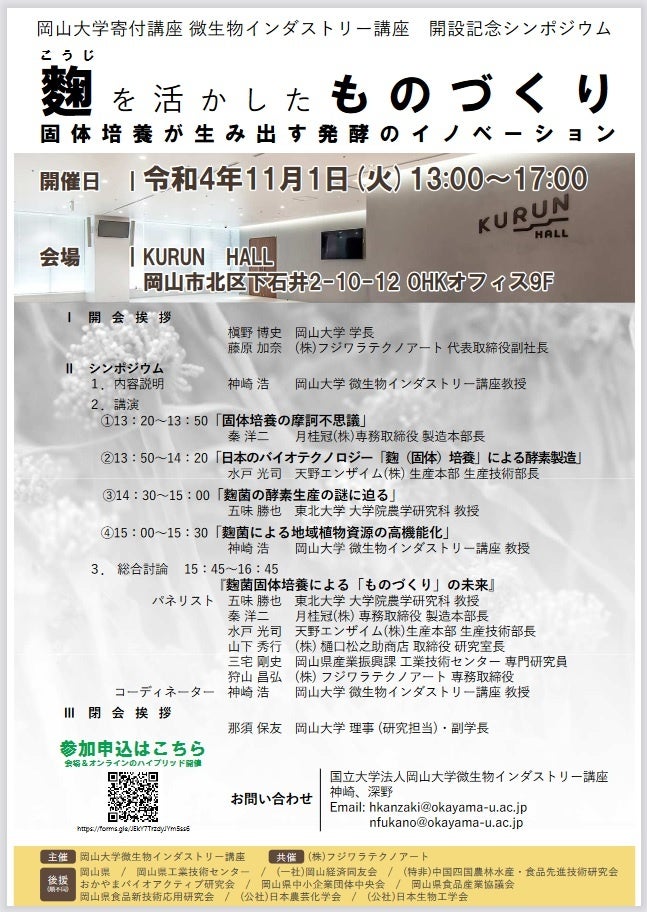 国立大学法人岡山大学(本部:岡山市北区、学長:槇野博史)の環境生命科学研究科微生物インダストリー講座は、2022年11月1日、岡山大学寄付講座微生物インダストリー講座開設記念シンポジウム「麴を活かしたものづくり 固体培養が生み出す発酵のイノベーション」を神崎浩教授によるコーディネートで岡山市北区のKURUN HALLで開催し、企業の方、一般の方、自治体関係者、大学生、他大学教員、本学関連教員など約470人(対面:約100人、オンライン:約370人)が参加しました。
