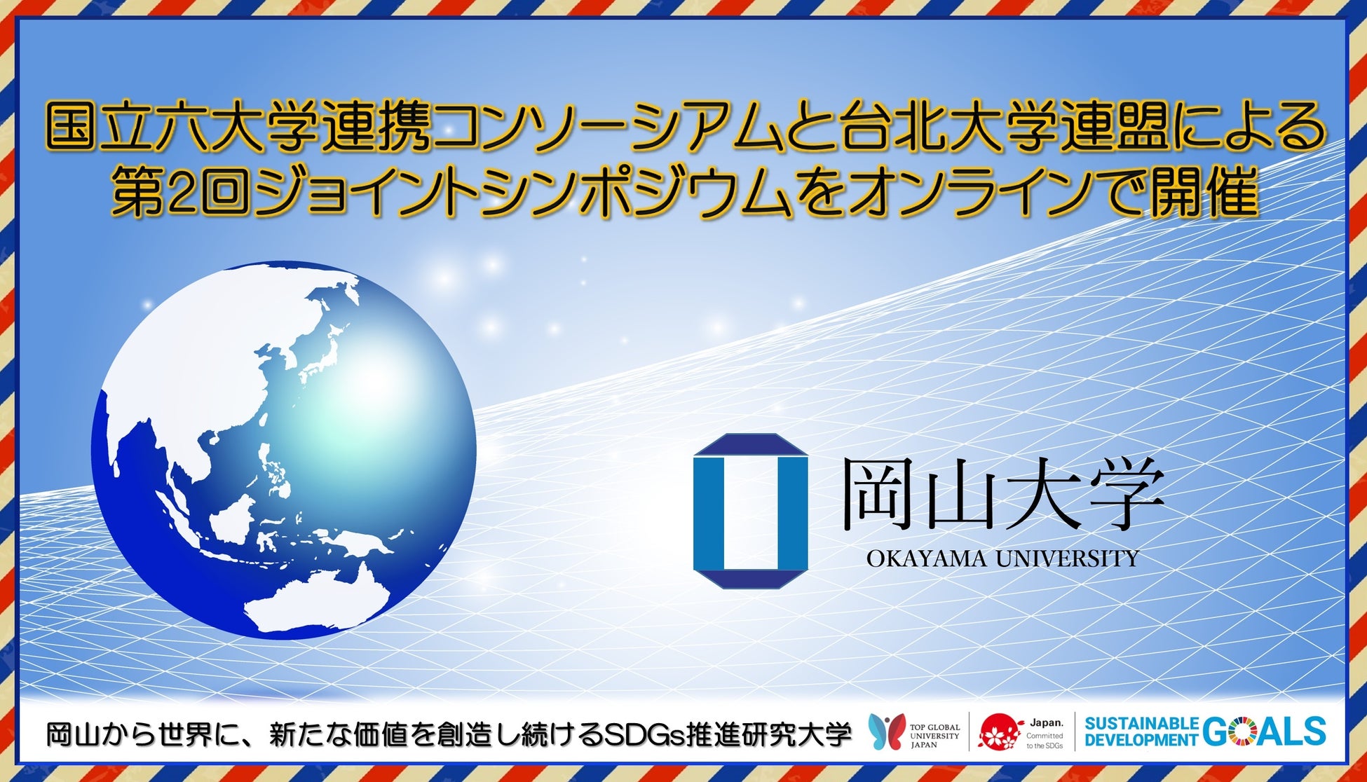 国立大学法人岡山大学(本部:岡山市北区、学長:槇野博史)の鈴木孝義国際担当副学長が機構長を務める国立六大学国際連携機構では、2022年12月9日、国立六大学連携コンソーシアムと台北大学連盟との共催により、日本(千葉大学、新潟大学、金沢大学、岡山大学、長崎大学、熊本大学)と台湾(台北医学大学、国立台北科技大学、国立台北大学、国立台湾海洋大学)をオンラインで繋ぎ、両コンソーシアム間の研究交流の促進とネットワークの強化を目的として、ジョイントシンポジウムを開催しました。