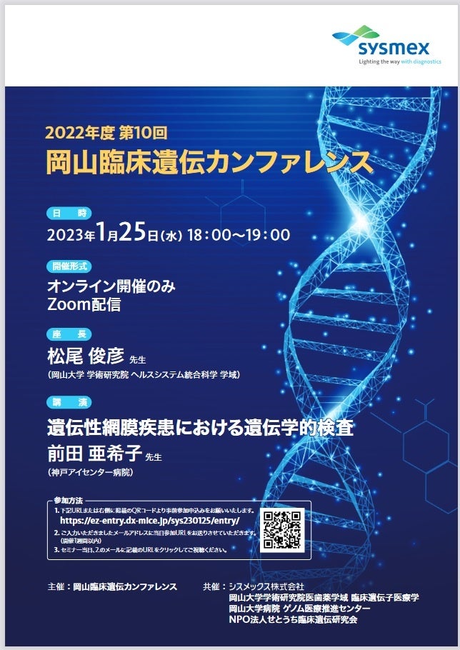 遺伝診療、遺伝カウンセリング、遺伝子診断に関心を持つ医療者などを対象として、症例検討やトピックスの紹介、抄読会、専門医の資格取得等の支援・情報交換等を行うカンファレンス「岡山臨床遺伝カンファレンス」の第10回を、岡山大学学術研究院臨床遺伝子医療学、岡山大学病院 ゲノム医療総合推進センターなどの共催のもと、2023年1月25日(水)にオンライン形式で開催します。