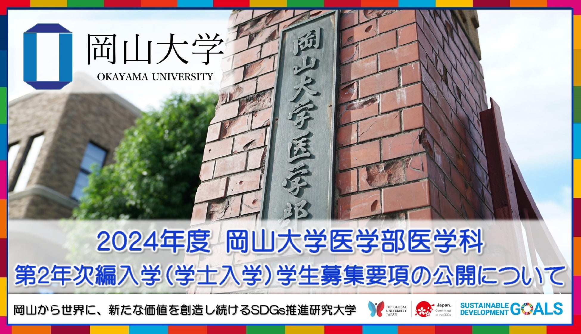 国立大学法人岡山大学(本部:岡山市北区津島中、学長:槇野博史)の医学部医学科では、第2年次編入学(学士入学)を実施しています。
