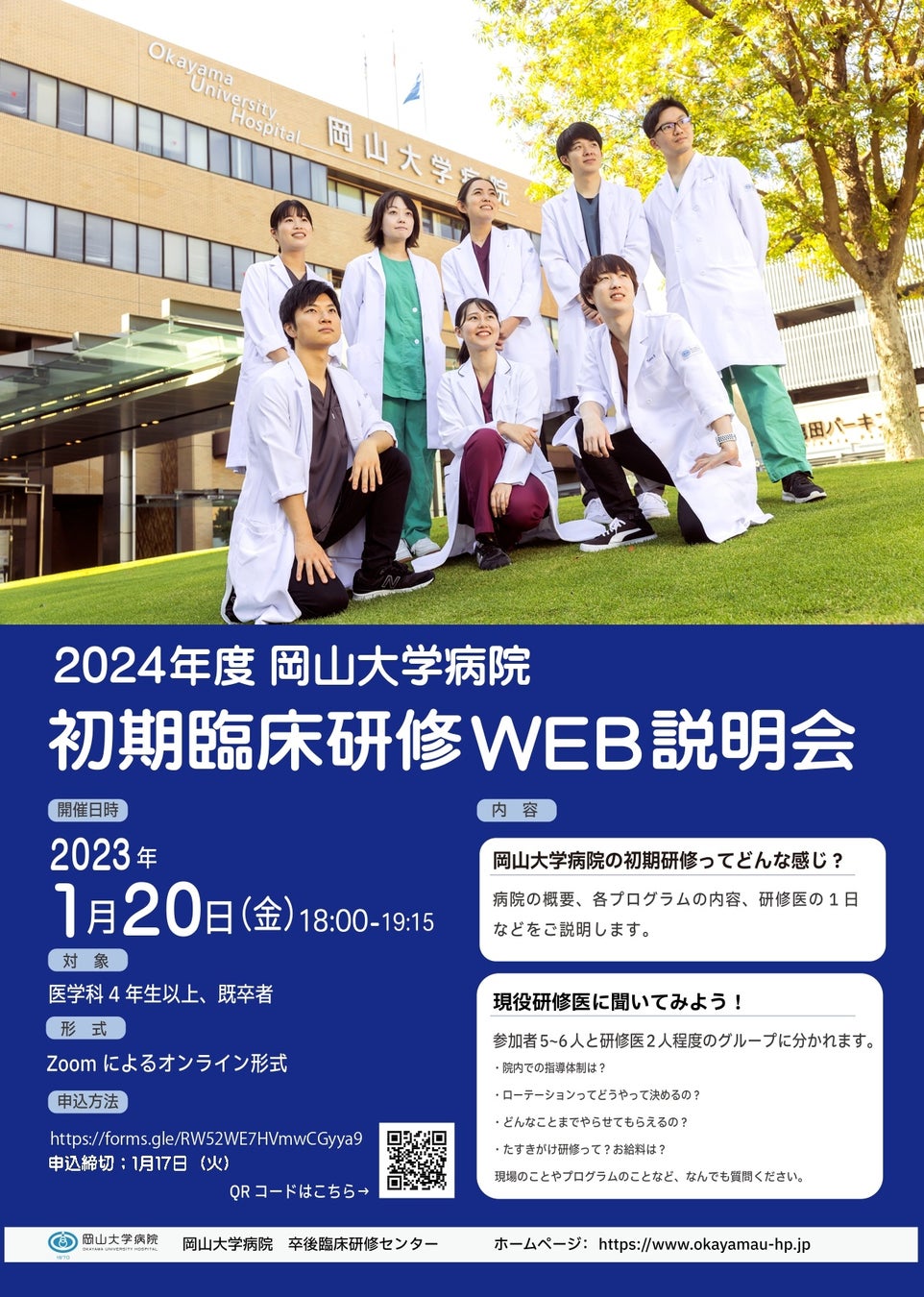国立大学法人岡山大学(本部:岡山市北区、学長:槇野博史)の岡山大学病院では、医学科4年生以上と既卒者を対象として、2023年1月20日(金)に「2024年度岡山大学病院初期臨床研修WEB説明会」をオンライン開催いたします。